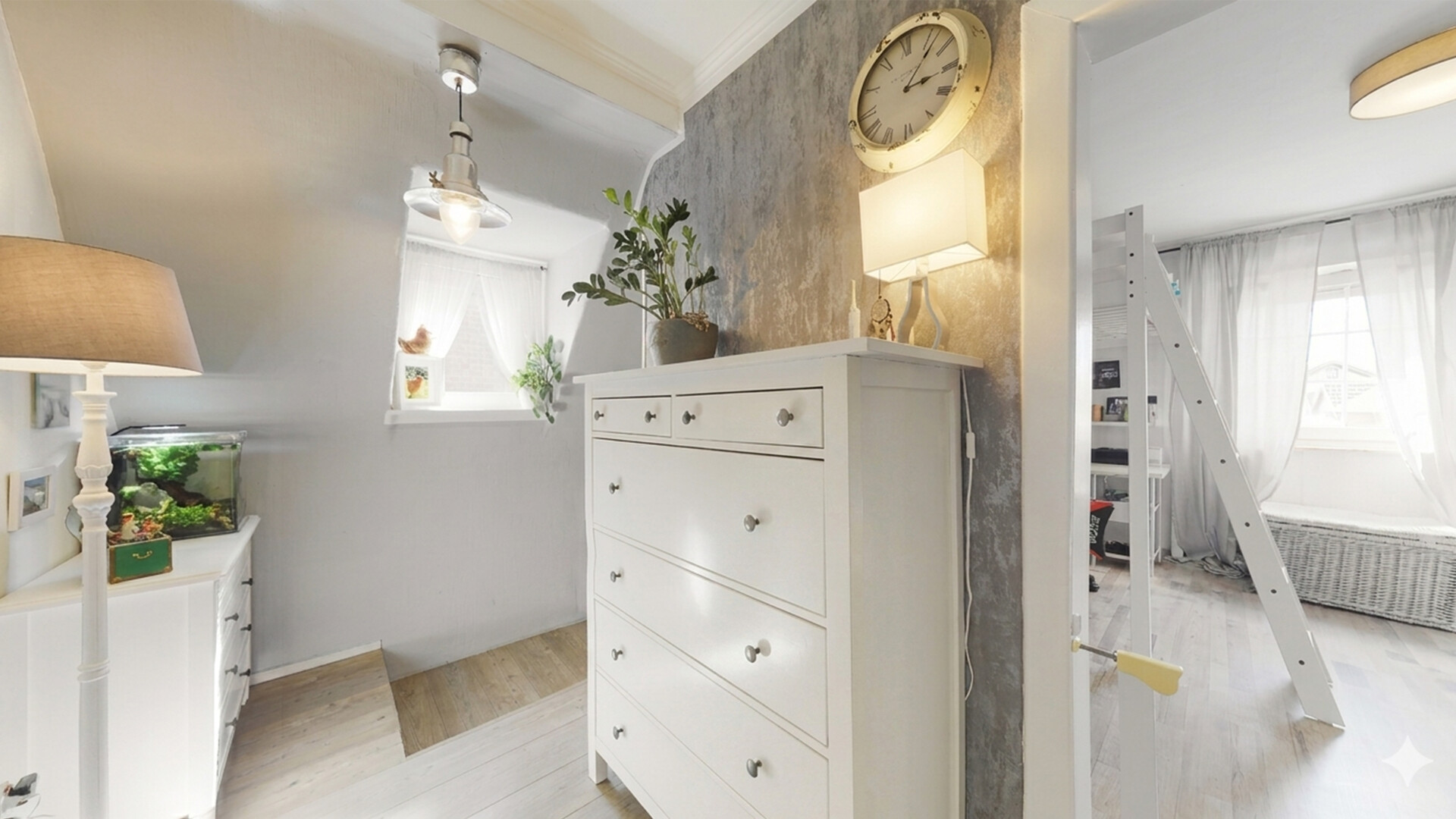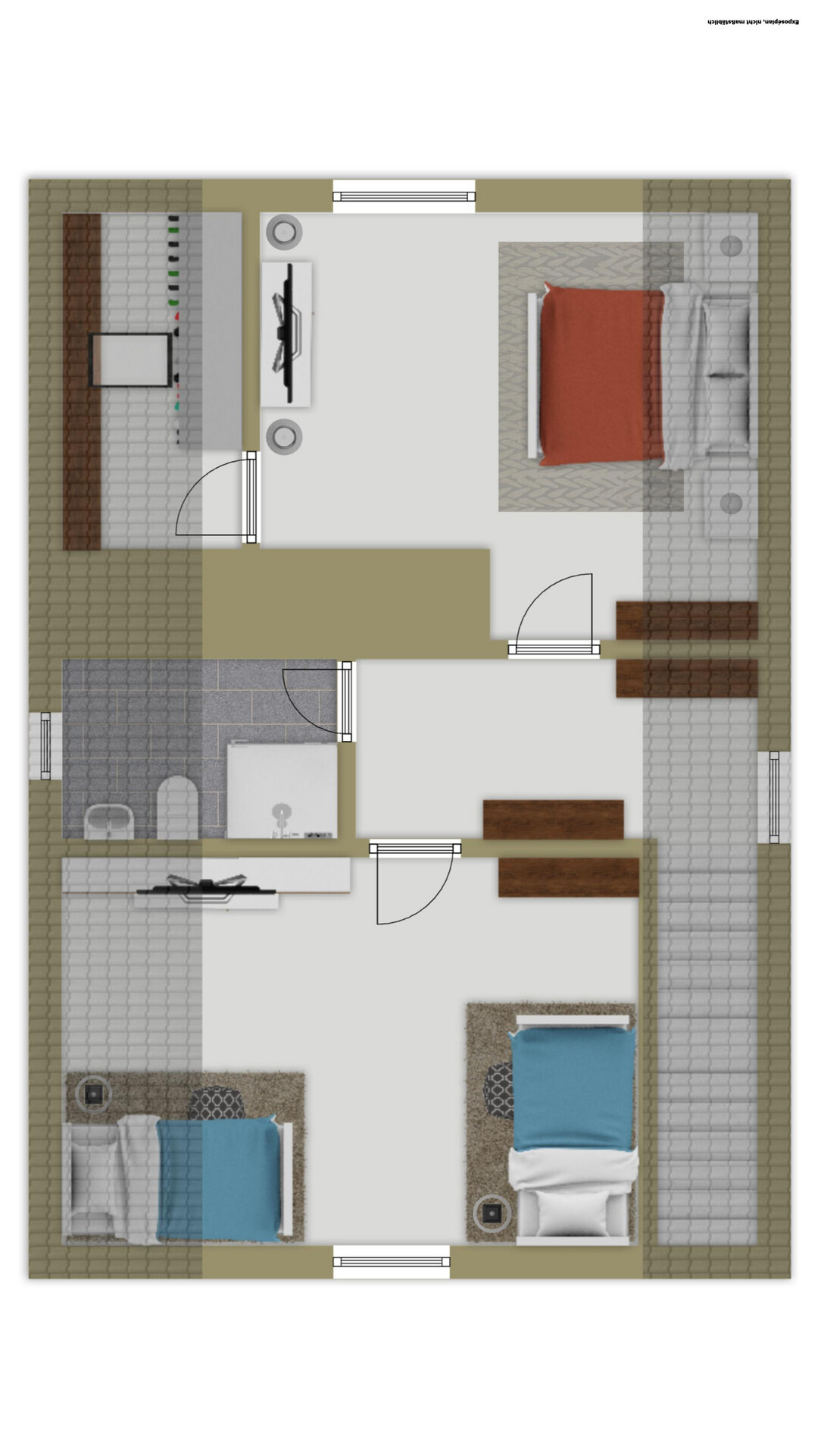 Im Obergeschoss befinden sich zwei gut geschnittene Schlafzimmer, die sich ideal als Eltern- und Kinderzimmer nutzen lassen. Ergänzt wird das Raumangebot durch ein weiteres Zimmer, das flexibel als Büro Ankleidebereich dienen kann. Das Tageslichtbad präsentiert sich gepflegt und zweckmäßig mit Dusche.