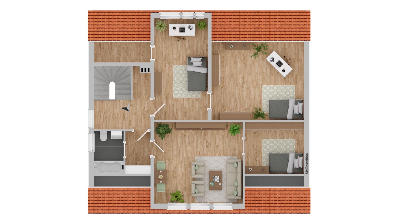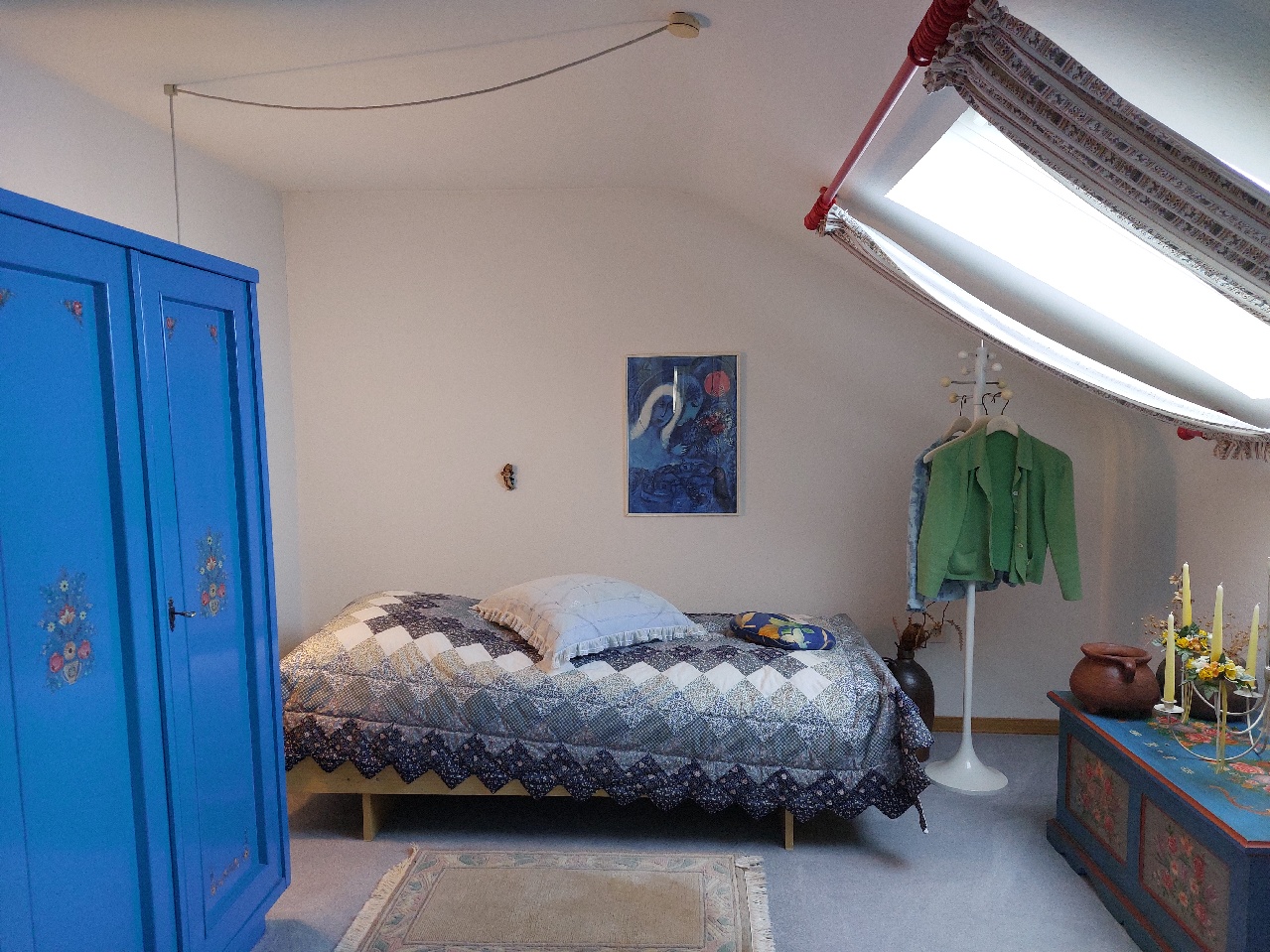 Vom Hausflur aus gelangt man in das Dachgeschoss. Hier wurden die zur Straße liegenden, ehemaligen Bodenräume durch eine Nutzungsänderung zu Wohnraum umgebaut. Zwei Wohn- oder Schlafräume, ein TL-Bad und eine kleine Kochecke sind ein Paradies für Kinder oder andere Familienmitglieder. Die beiden zum Garten liegenden Bodenräume wurden ebenfalls ausgebaut und mit einer Gaube, Fenster, Heizung, Wandverkleidung und Bodenbelägen ausgestattet. Bestens geeignet für Hobby und Freizeit.