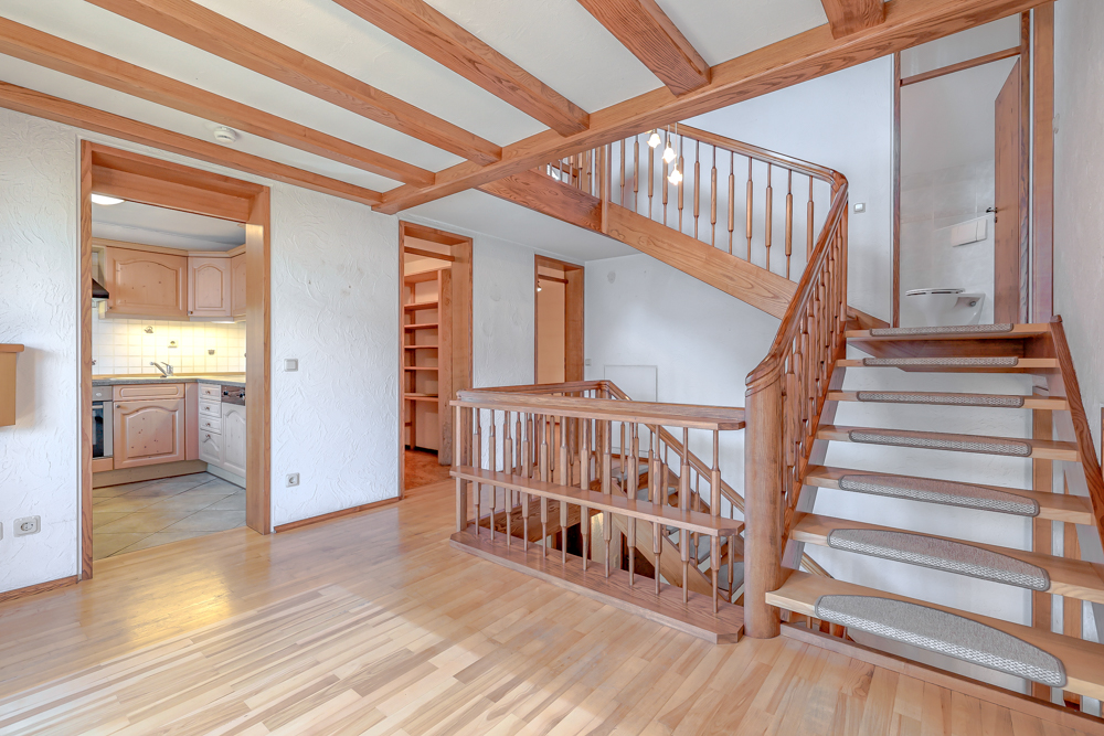 Das Highlight: Das maßgefertigte Treppenhaus, das sich eindrucksvoll vom Erdgeschoss bis unter die Dachspitze zieht. Besonders zur Weihnachtszeit schafft es den perfekten Rahmen für einen festlich geschmückten Baum – ein einzigartiges Ambiente, das Sie begeistern wird.