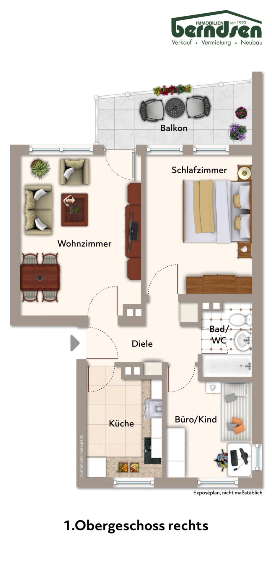Flur, Küche, Kinderzimmer/ Arbeitszimmer, Badezimmer, Schlafzimmer, Wohnzimmer mit Balkon