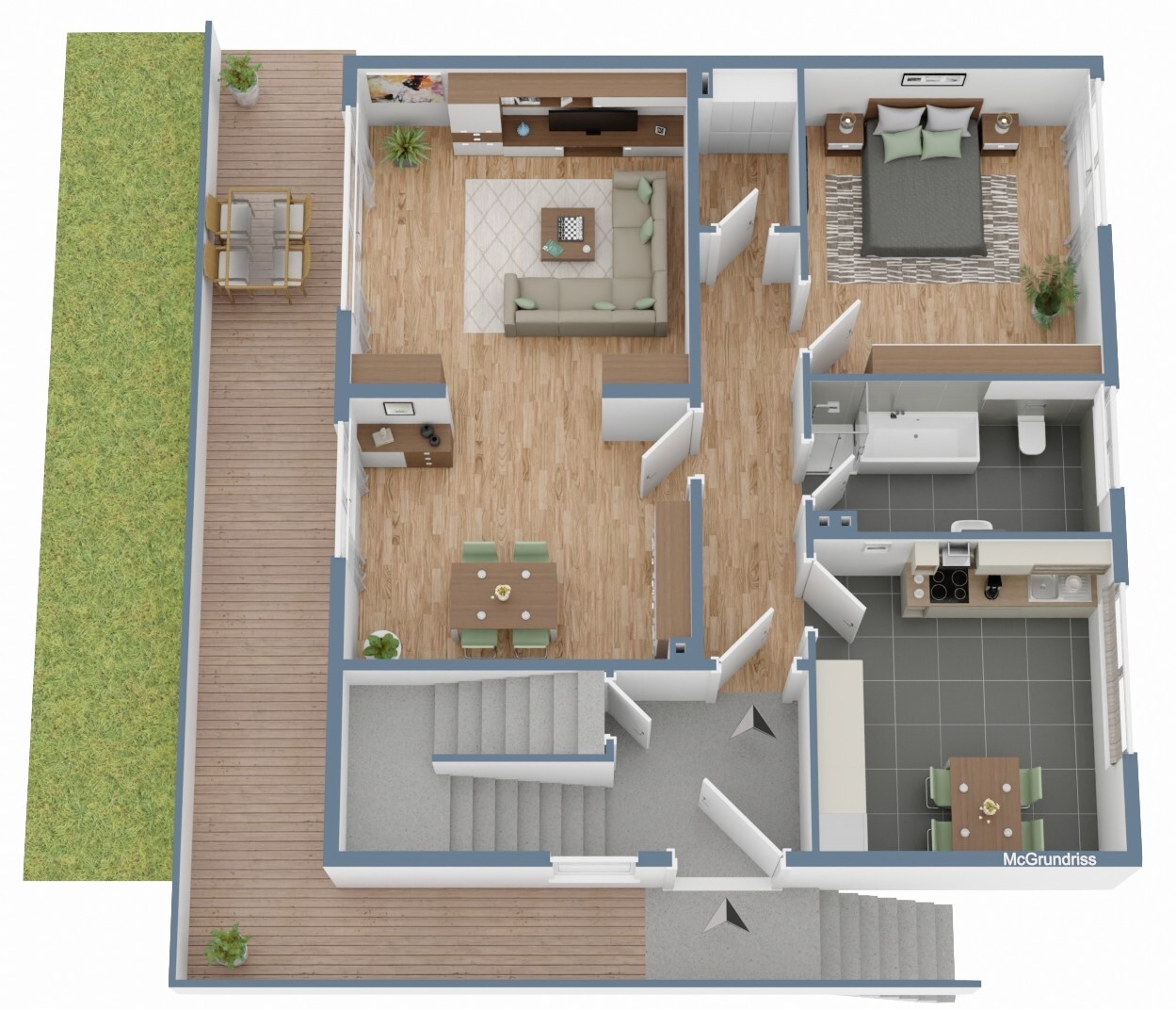 Die ca. 93 m² große Erdgeschosswohnung verfügt über eine große Wohnküche, ein Tageslichtbad mit Badewanne und Dusche, aktuell ein Schlafzimmer sowie ein offen gestaltetes Wohn-/Esszimmer mit direktem Zugang auf die ca. 50 m² große Terrasse mit angrenzendem Gartenbereich. Am Ende der Wohnungsdiele befindet sich zudem ein praktischer Abstellraum.