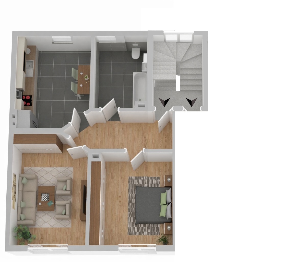 Bodenbeläge: Fliesen im Bad, Vinyl in Wohn-/ und Schlafzimmer sowie der Küche
