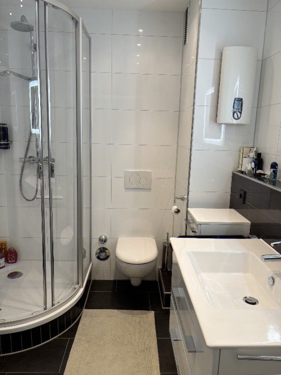 Der Lift bringt Sie von der Tiefgarage bis vor die Wohnungstür. Vom Flur gehen das Wohnzimmer mit überdachtem Balkon, die Einbauküche, das Gäste-WC, ein Abstellraum und das Schlafzimmer ab. Vom Schlafzimmer aus gelangen Sie in das großzügige Masterbad.