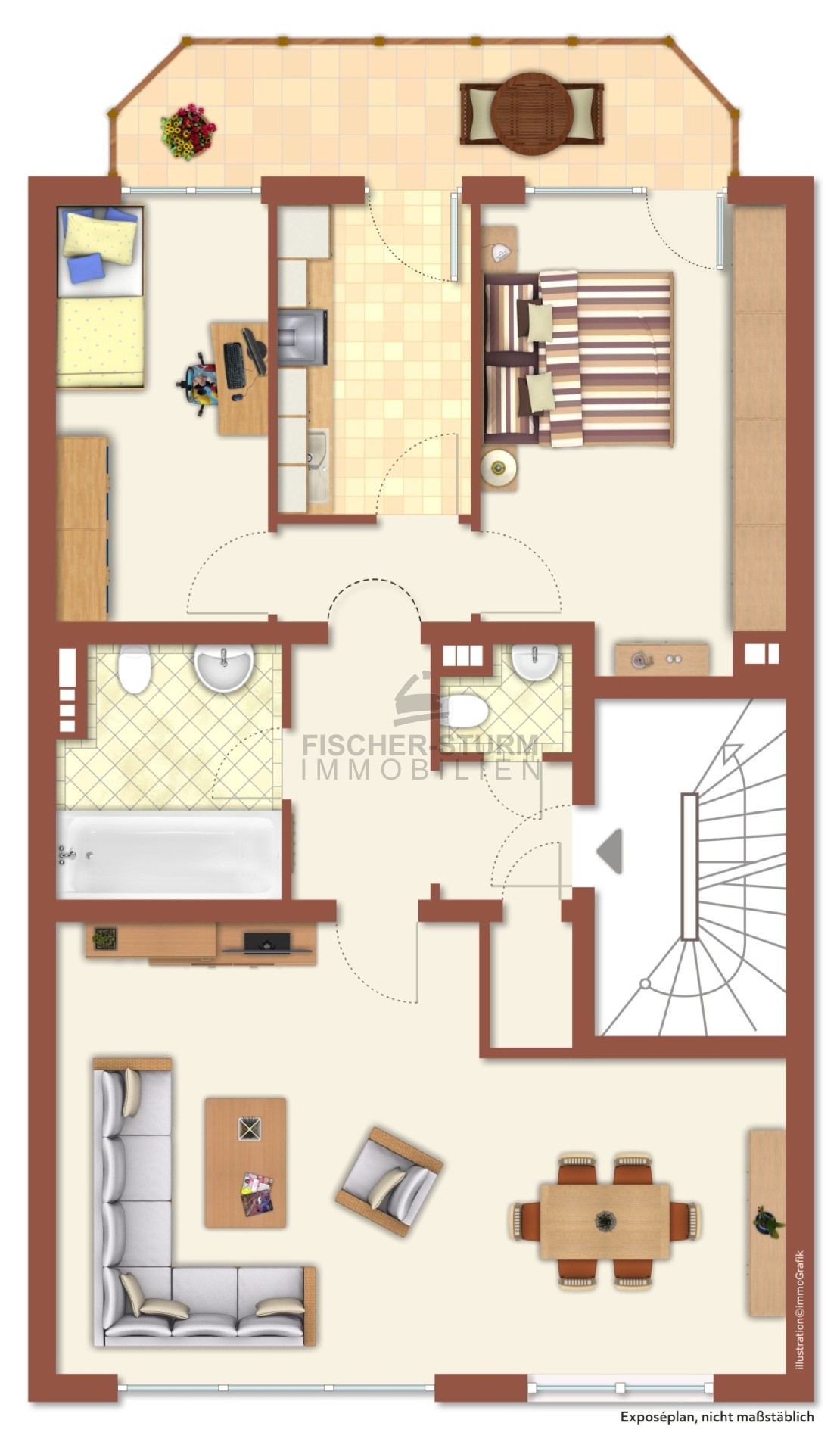 Alle Räume gehen von der Eingangsdiele ab. Das großzügige, helle Wohn-Esszimmer ist zur Straße, die beiden Schlafzimmer sowie die Küche sind zur Rückseite gelegen. Sowohl das größere Schlafzimmer, als auch die (Arbeits-)Küche verfügen über Zugänge zum ostwärts gelegenen Balkon, der reichlich Platz für Tisch und Stühle bietet.