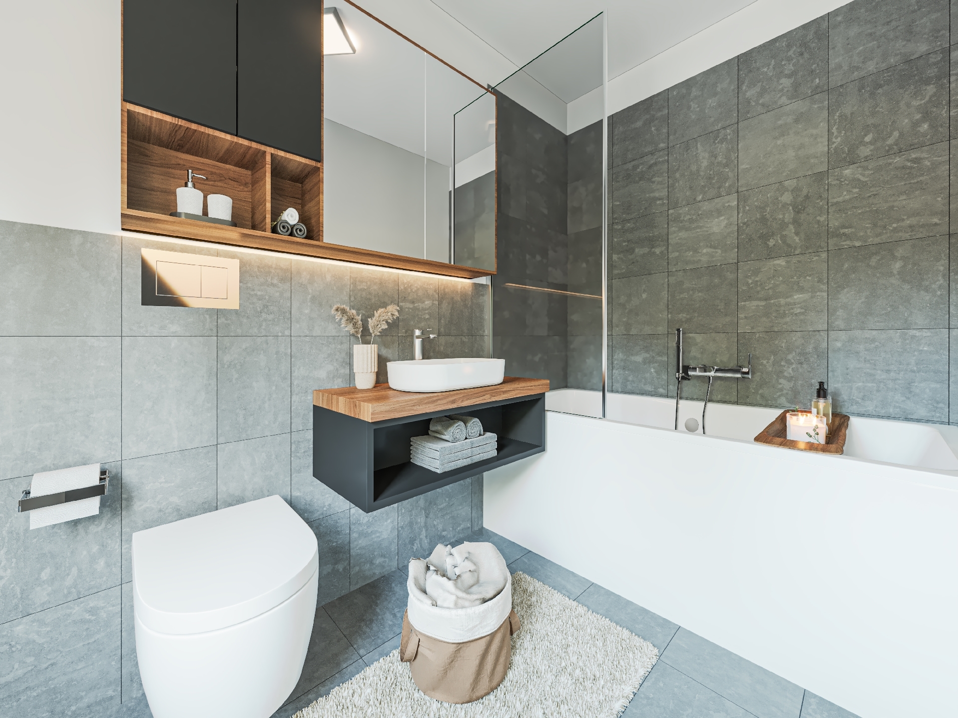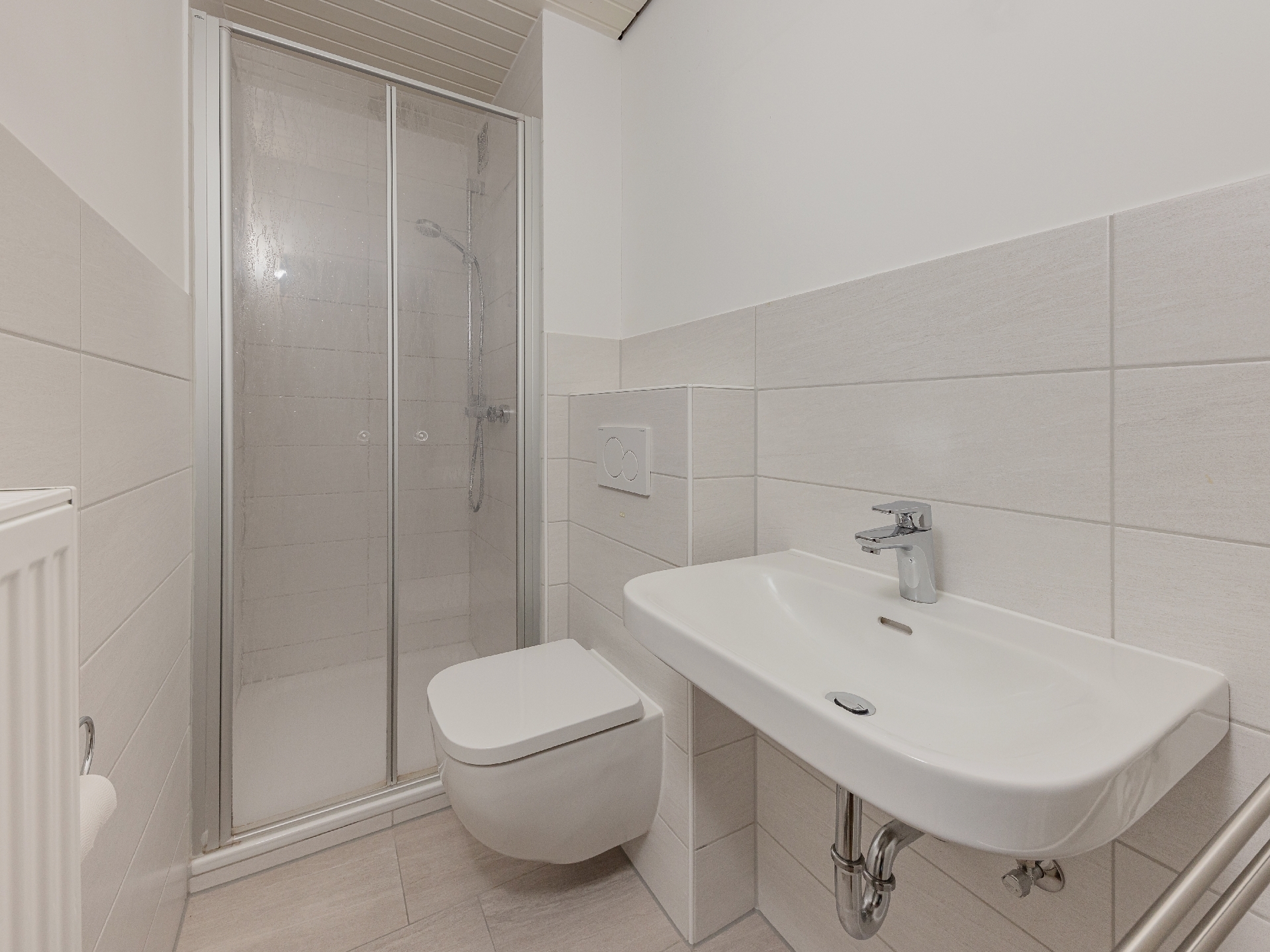 Das Familienbad mit Badewanne entspricht dem baujahrtypischen Charme, während das separate Duschbad bereits modernisiert wurde und Komfort im Alltag garantiert. Ein praktischer Abstellraum rundet den funktionalen Bereich ab.