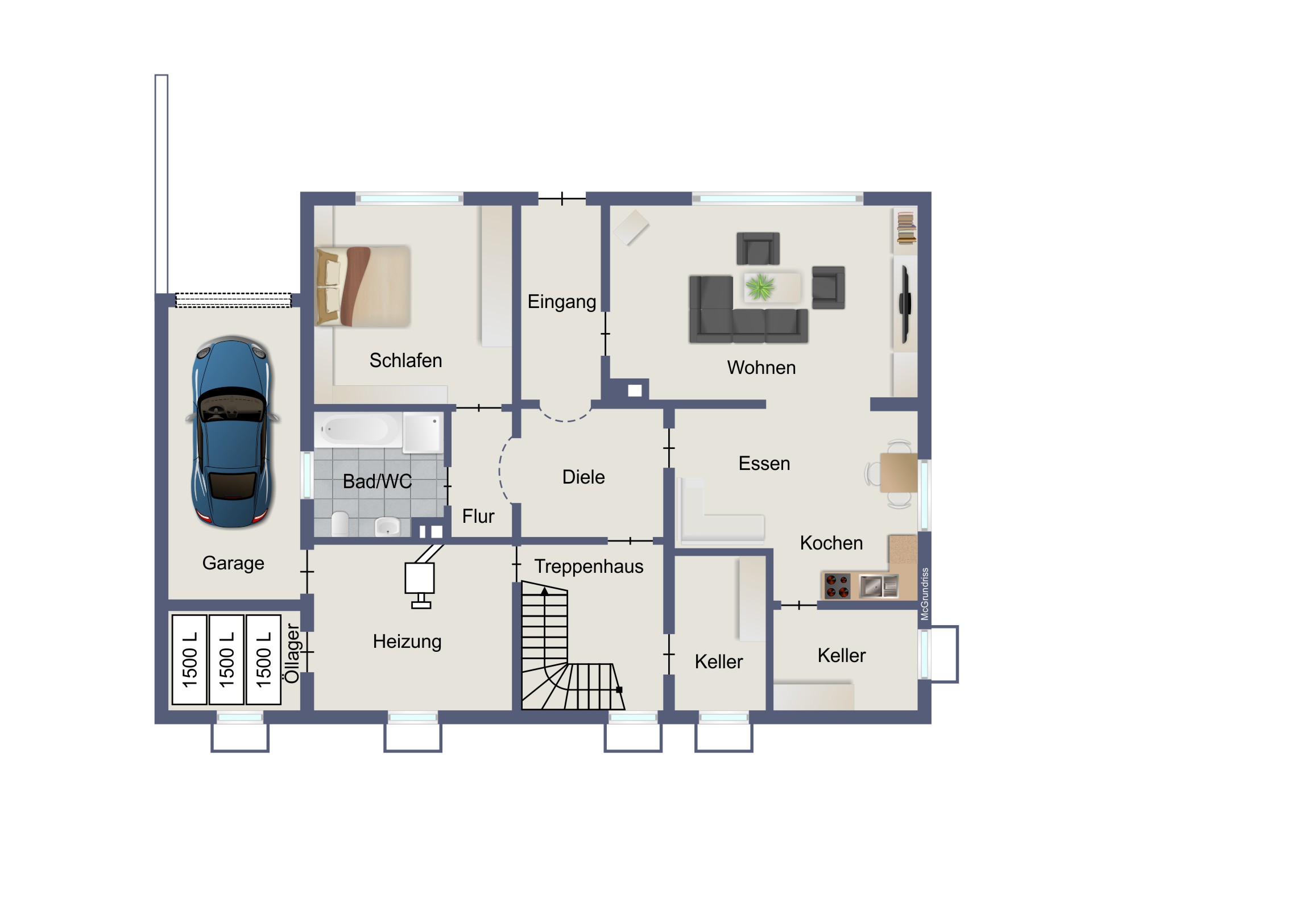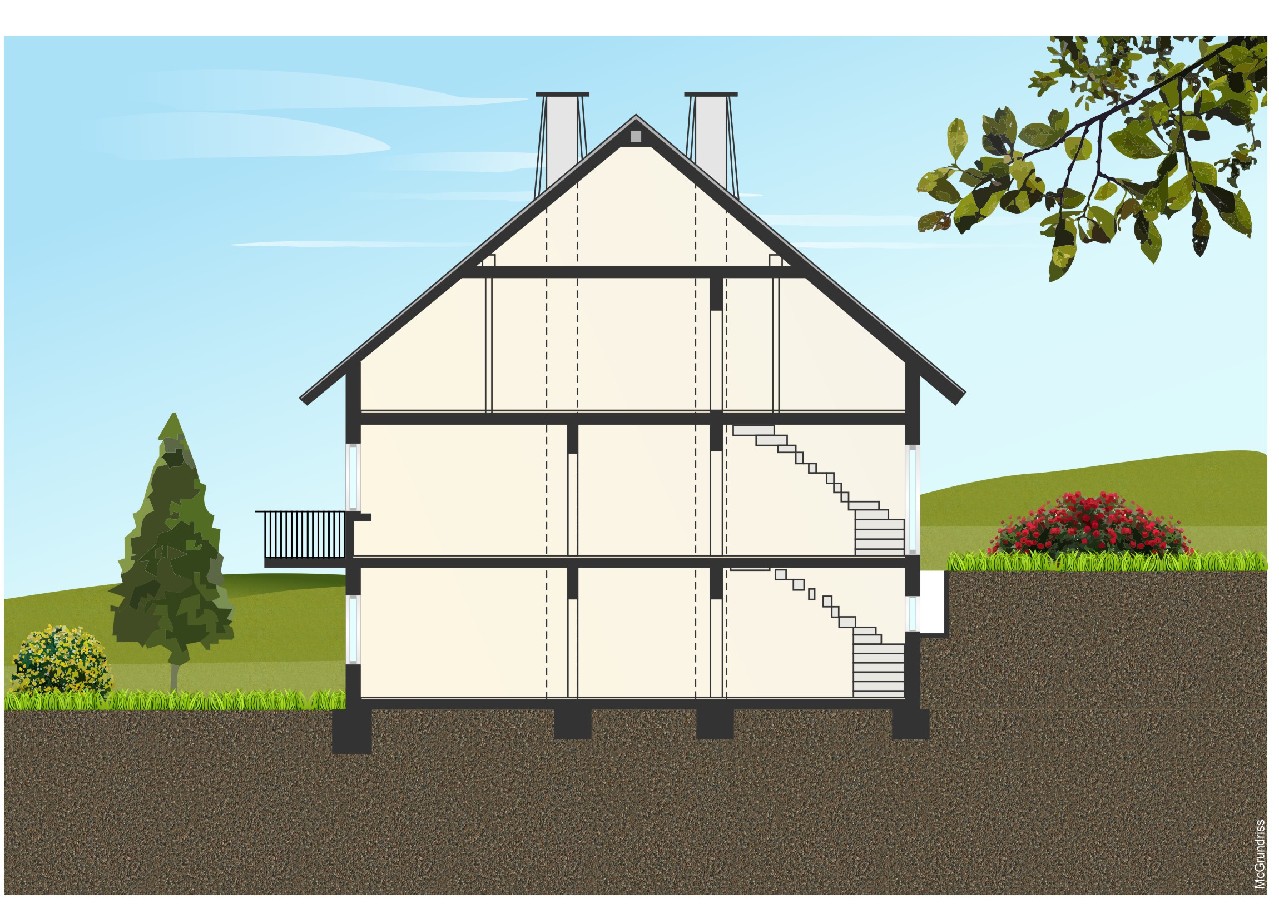 • Souterrain ca. 80 m² Wohnfläche: 2 Zimmer, Kochen-/Essen, Diele, Bad/WC und Terrasse. Erdgeschoss ca. 100 m² Wohnfläche: 5 Zimmer, Küche, Diele, Bad/WC, Gäste-WC und Balkon. Dachgeschoss je ca. 45 m² Wohnfläche: 2 Wohnungen mit je 2 Zimmer, Küche, Diele, Bad/WC und Balkon. Garage.