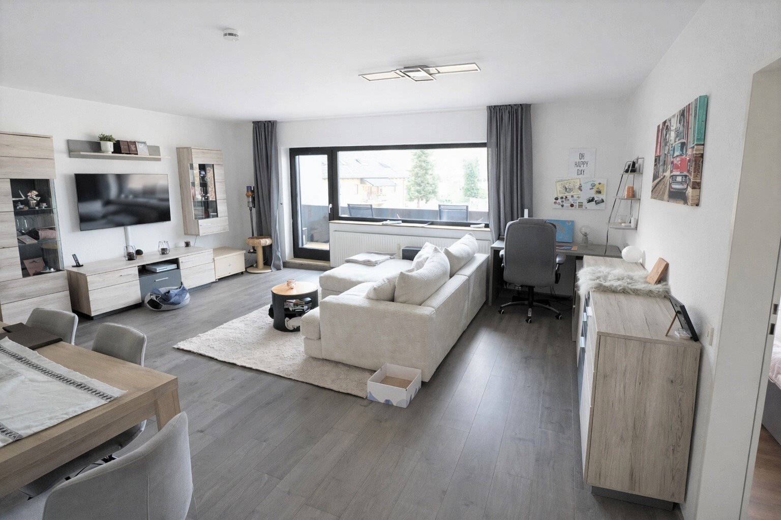 Der großzügige Wohnbereich mit ca. 32 m² bildet das Herzstück der Wohnung. Durch die große Fensterfront ist der Raum hervorragend belichtet und bietet direkten Zugang zum überdachten Balkon. Die Fläche ermöglicht problemlos die Einrichtung einer Wohnlandschaft sowie eines Essbereichs. Die offen angrenzende Küche fügt sich harmonisch in das Raumkonzept ein und unterstreicht den modernen, offenen Wohncharakter.