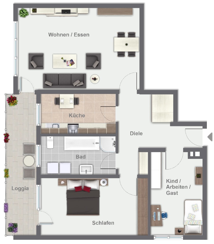 Bereits beim Betreten der Wohnung empfängt Sie eine großzügige Diele mit Abstellkammer. Das lichtdurchflutete Wohnzimmer bildet das Herzstück der Wohnung und begeistert durch seine Größe sowie den direkten Zugang zur überdachten Loggia. Ein besonderes Highlight: Das Tor sorgt für einen direkten, praktischen Zugang ideal, um Einkäufe bequem und ohne Umwege in die Wohnung zu bringen. Auch eines der Schlafzimmer verfügt über einen direkten Loggiazugang und unterstreicht den hohen Wohnkomfort. Ein drittes Zimmer lässt sich flexibel als Kinder-, Gäste- oder Arbeitszimmer gestalten. Ergänzt wird das Raumangebot durch eine separate Küche mit Platz für eine kleine Sitzgelegenheit sowie ein helles Tageslichtbad mit Dusche und Badewanne. Hier befindet sich zudem ein praktischer Anschluss für die Waschmaschine.