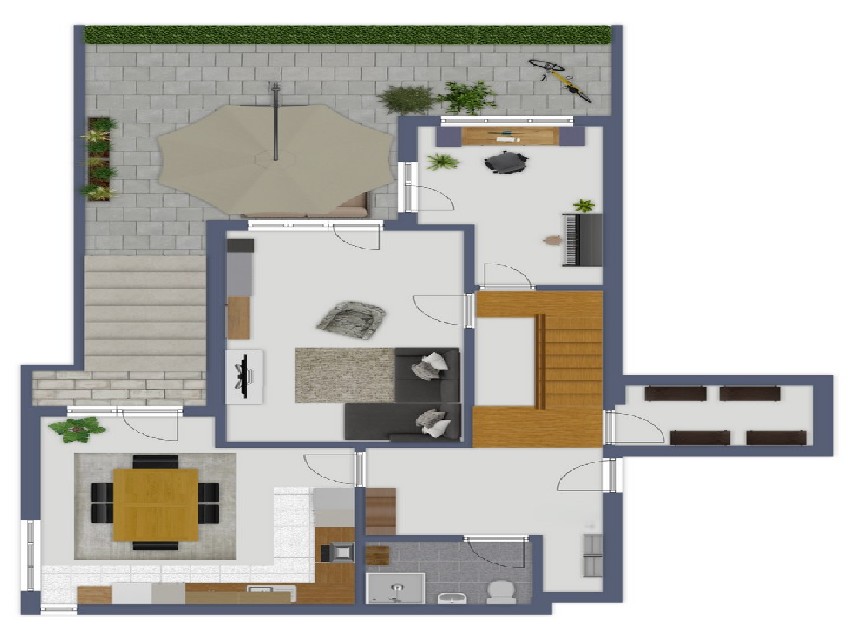Ein besonderes Highlight ist der Freisitz direkt vor der Küche, der nahtlos in den größeren Terrassenbereich übergeht, ideal für Frühstück im Freien oder als grüne Erweiterung des Wohnraums.