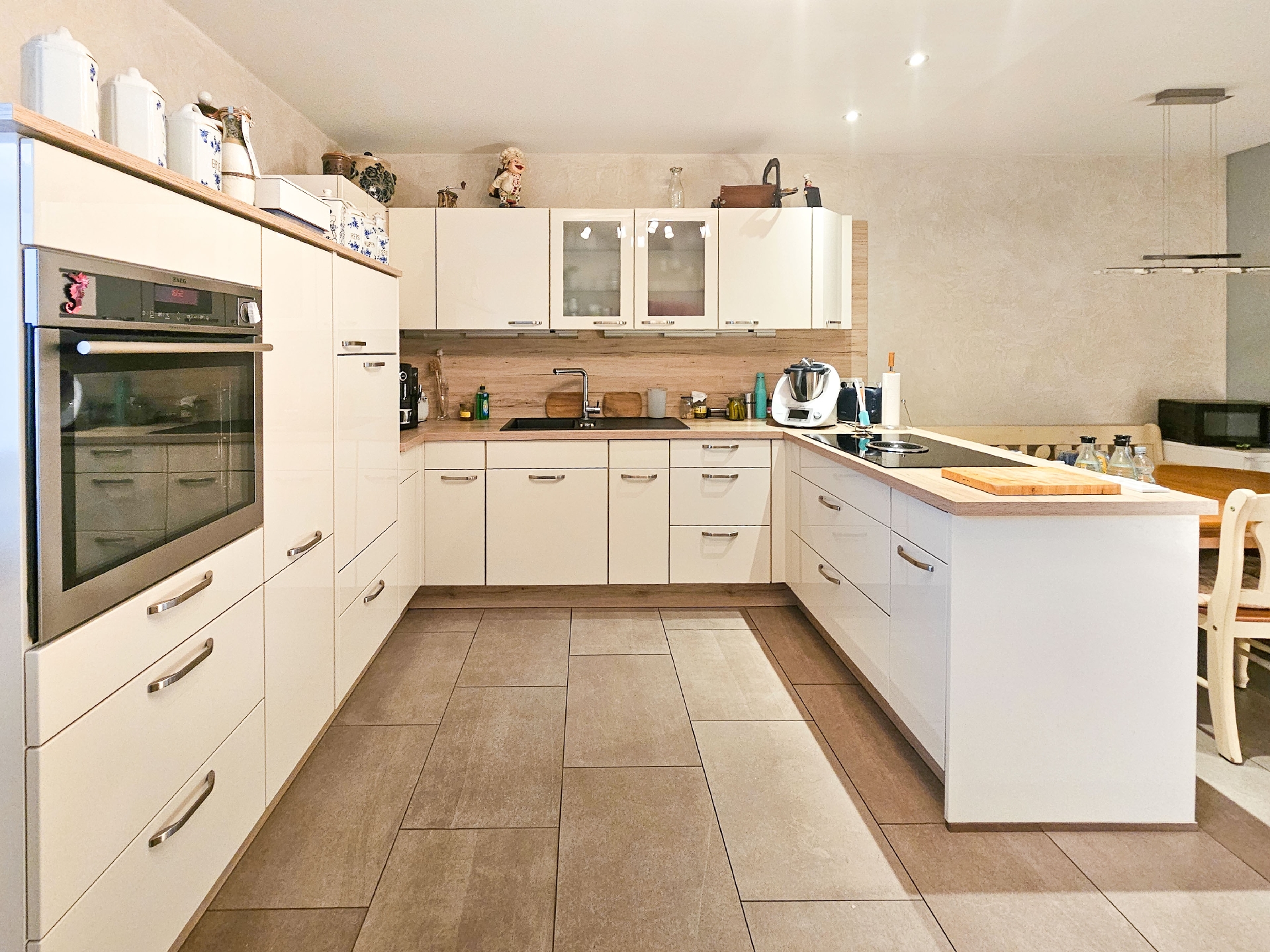 eignet. Die über 20 m² große Wohnküche bietet nicht nur ausreichend Platz, sondern ist mit hochwertigen Elektrogeräten und stilvollen Einbauten ausgestattet, sodass sie sowohl funktional als auch optisch überzeugt.