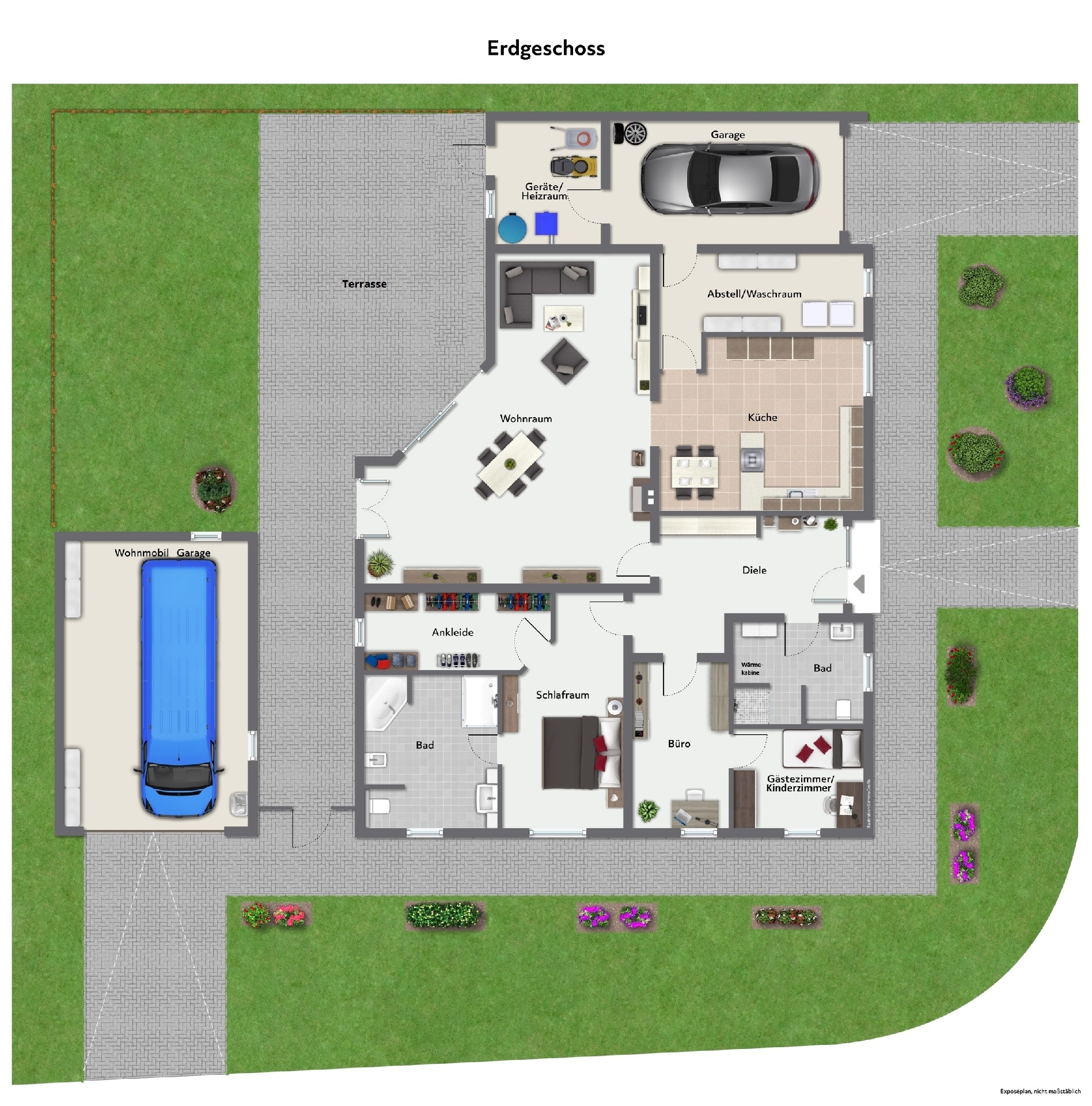 Im Gäste-/Kinderbereich gibt es ein großzügiges Gästebad, das ebenfalls mit einer bodentiefen Dusche ausgestattet ist. Ein besonderes Highlight ist die integrierte Wärmekabine. Zusätzlich ist ein Büro und ein Schlafzimmer vorhanden.