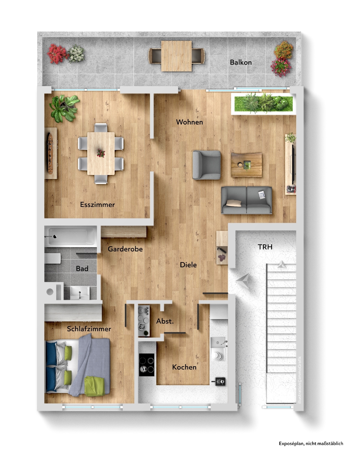 – OG: Wohn-/Essbereich, weiteres Zimmer, Küche, Diele, Badezimmer, Abstellraum, Balkon