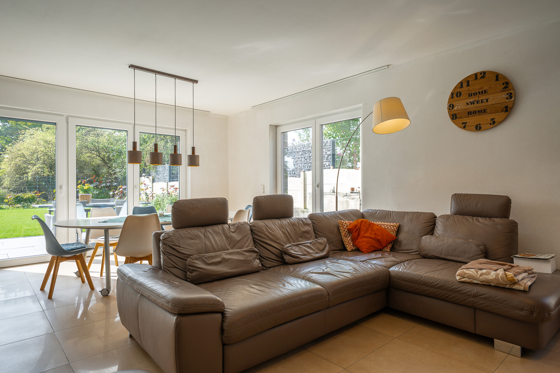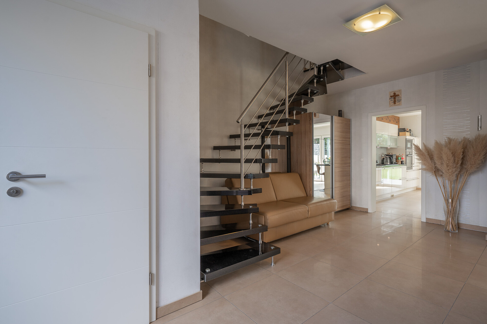 Die Immobilie fügt sich unaufdringlich in ein gepflegtes Wohnumfeld ein, umgeben von Grünflächen und freiem Blick in die Natur, was ein Gefühl von Weite und Ruhe vermittelt. Einkaufsmöglichkeiten, Schulen und Kindertagesstätten sind bequem erreichbar, während die Nachbarschaft Privatsphäre und Gelassenheit garantiert.