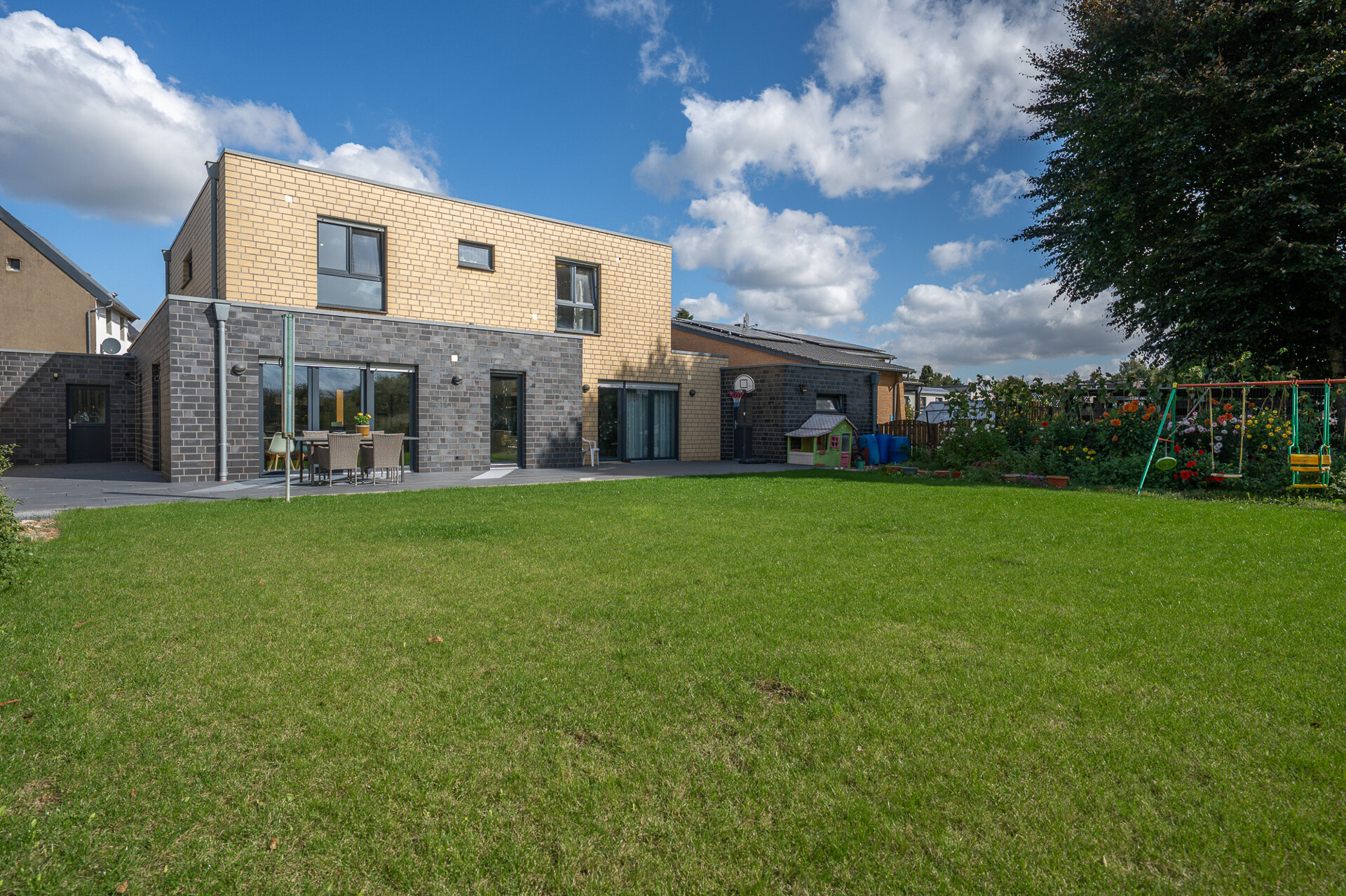 Die sonnige Südterrasse öffnet sich direkt zum weitläufigen Garten und wird zum erweiterten Wohnzimmer unter freiem Himmel. Hier kann die Familie unbeschwert spielen, die Natur genießen oder entspannte Stunden verbringen – mit dem Feldblick als ständigem Begleiter, der Weite und Freiheit vermittelt.