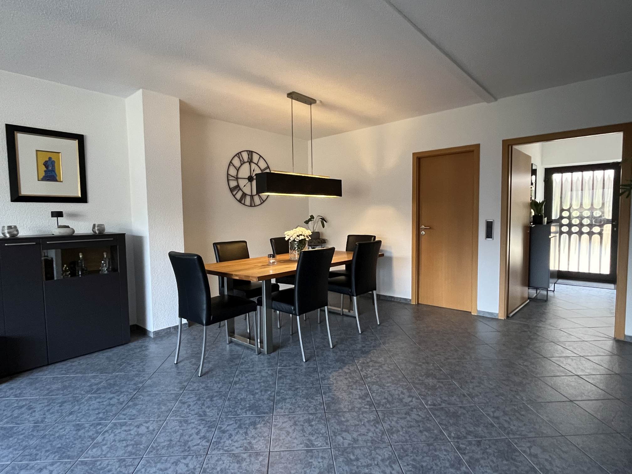 Die Ausstattung präsentiert sich aktuell wie aus dem Ei gepellt – das Haus wurde in 2002 umfassend modersinisert, u.a. graue Bodenfliesen im EG, Laminat im OG, neue Innentüren, Wände mit Rauhfaserputz versehen, Treppenhaus modernisiert, Bad und Gäste-WC ebenfalls aus 2002. Die Beheizung erfolgt über eine Öl-Zentral-Heizung mit Warmwasseraufbereitung aus dem Baujahr 1994. Lediglich das Bad im DG und die Fenster entsprechen dem Baujahr. Die Markise über der Terrasse wurde erst in 2025 erneuert. Die schicke Einbauküche ist ebenfalls bereits im Kaufpreis enthalten.