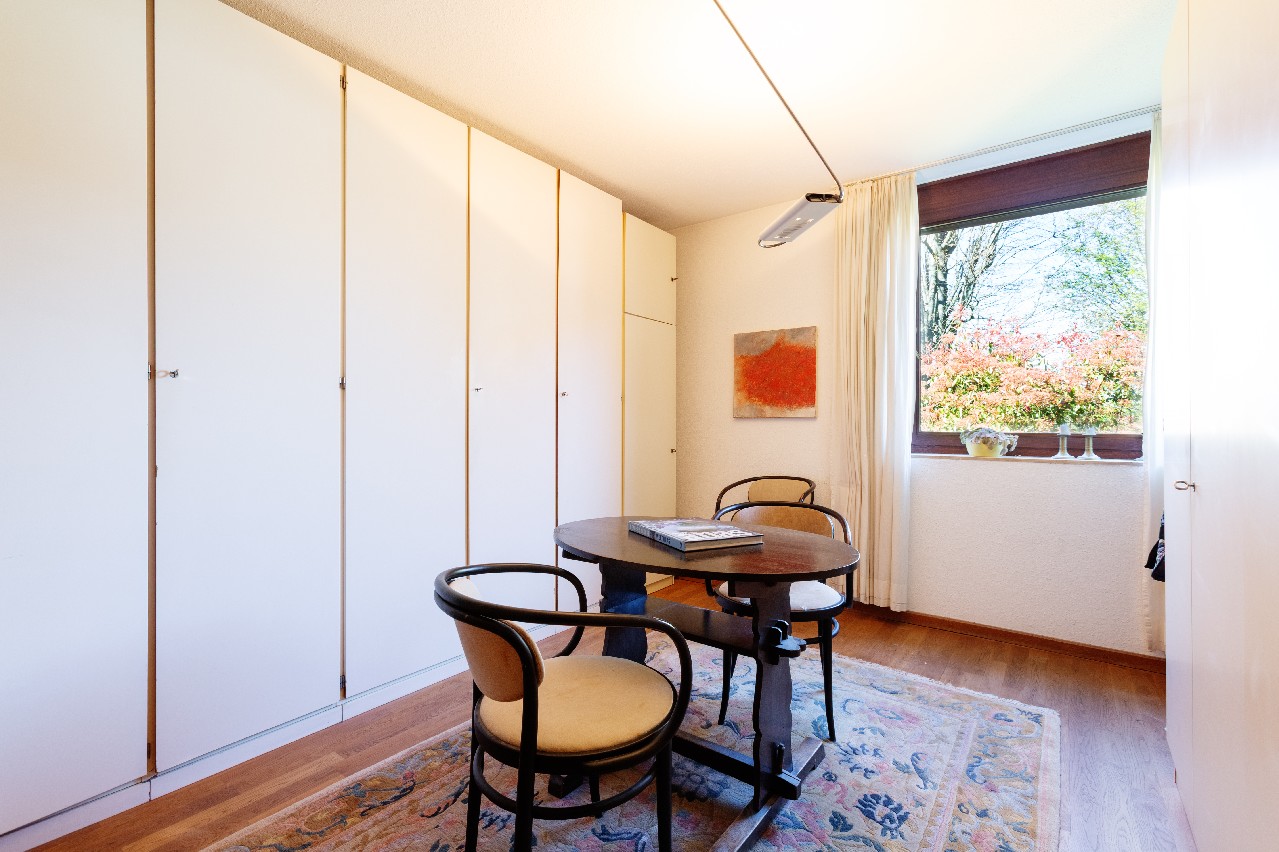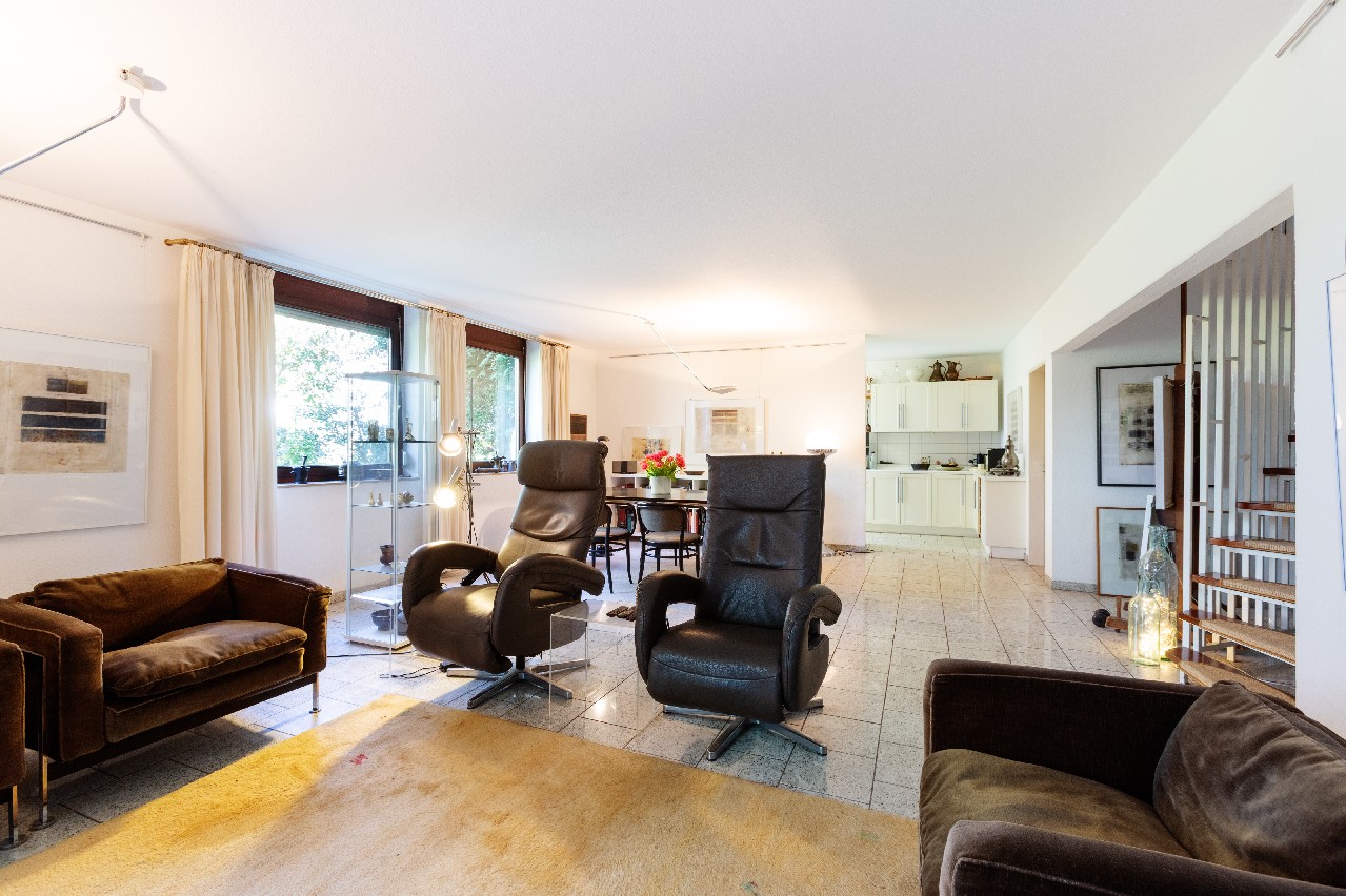 Dieses außergewöhnliche Reiheneckhaus, errichtet 1981, ist kein Haus von der Stange. Es präsentiert sich als ruhiger Rückzugsort für Familien oder Paare, die das Wohnen auf verschiedenen Ebenen und einen idyllischen Garten (Sondernutzungsrecht) zu schätzen wissen.
