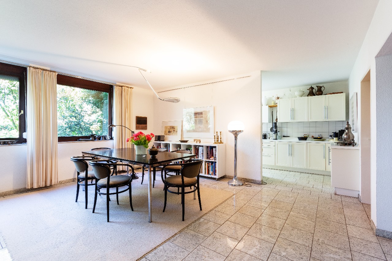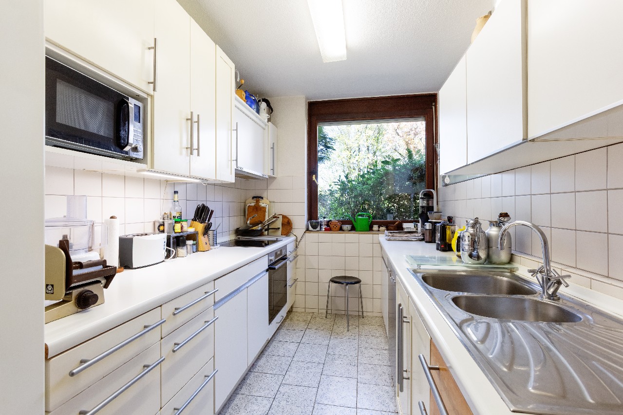 Die angrenzende Küche ermöglicht kurze Wege, während ein großer Hausanschlussraum/Keller ausreichend Stauraum bietet. Ein besonderer Pluspunkt und eine deutliche Erleichterung bei dem Umzug ist, dass die bestehende moderne, weiße Einbauküche, die sich perfekt in das helle Ambiente einfügt, nach Absprache (ohne Kühlschrank) übernommen werden kann.