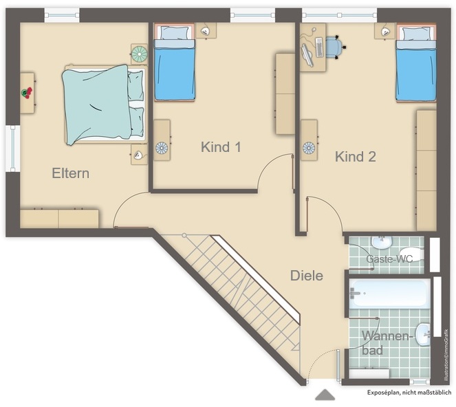 Sie betreten das Haus über eine geräumige Diele. Auf dieser Eingangsebene befinden sich ein Hauptschlafzimmer, zwei helle Kinderzimmer sowie ein Wannenbad und ein separates Gäste-WC. Alle drei Schlafräume haben sehr gute, funktionelle Größen. Im Badezimmer finden Sie ein Tageslichtfenster vor.