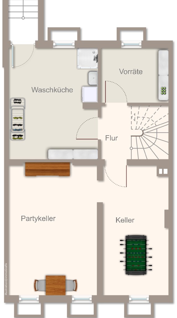 •Kellerbereich: überwiegend gefliest, teilweise Teppichboden in wohnlich ausgebauten Bereichen