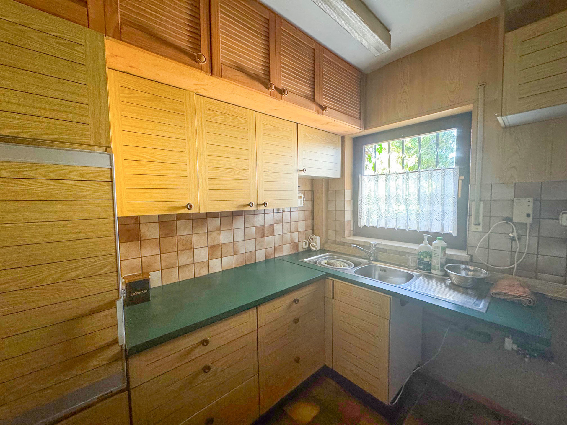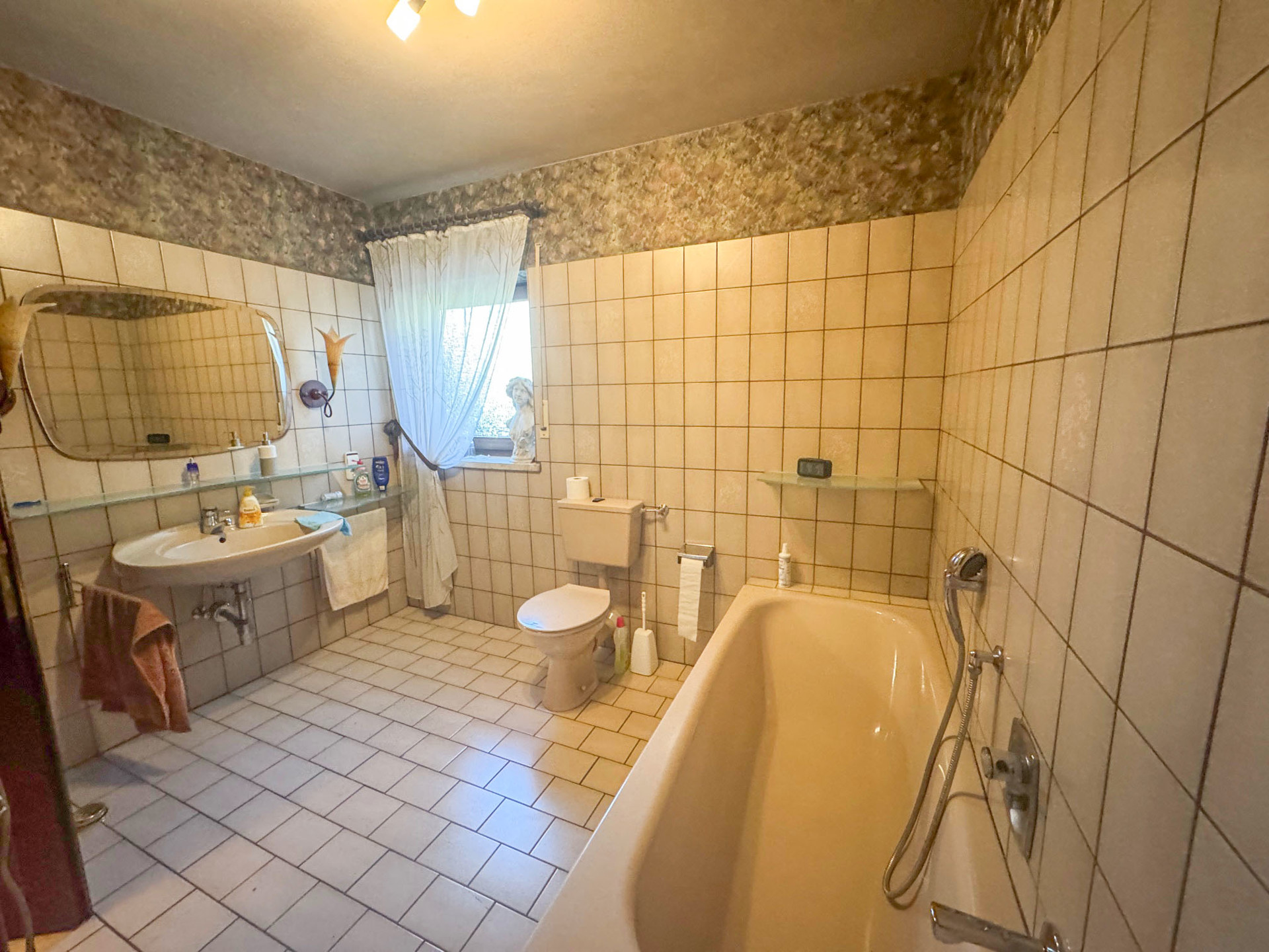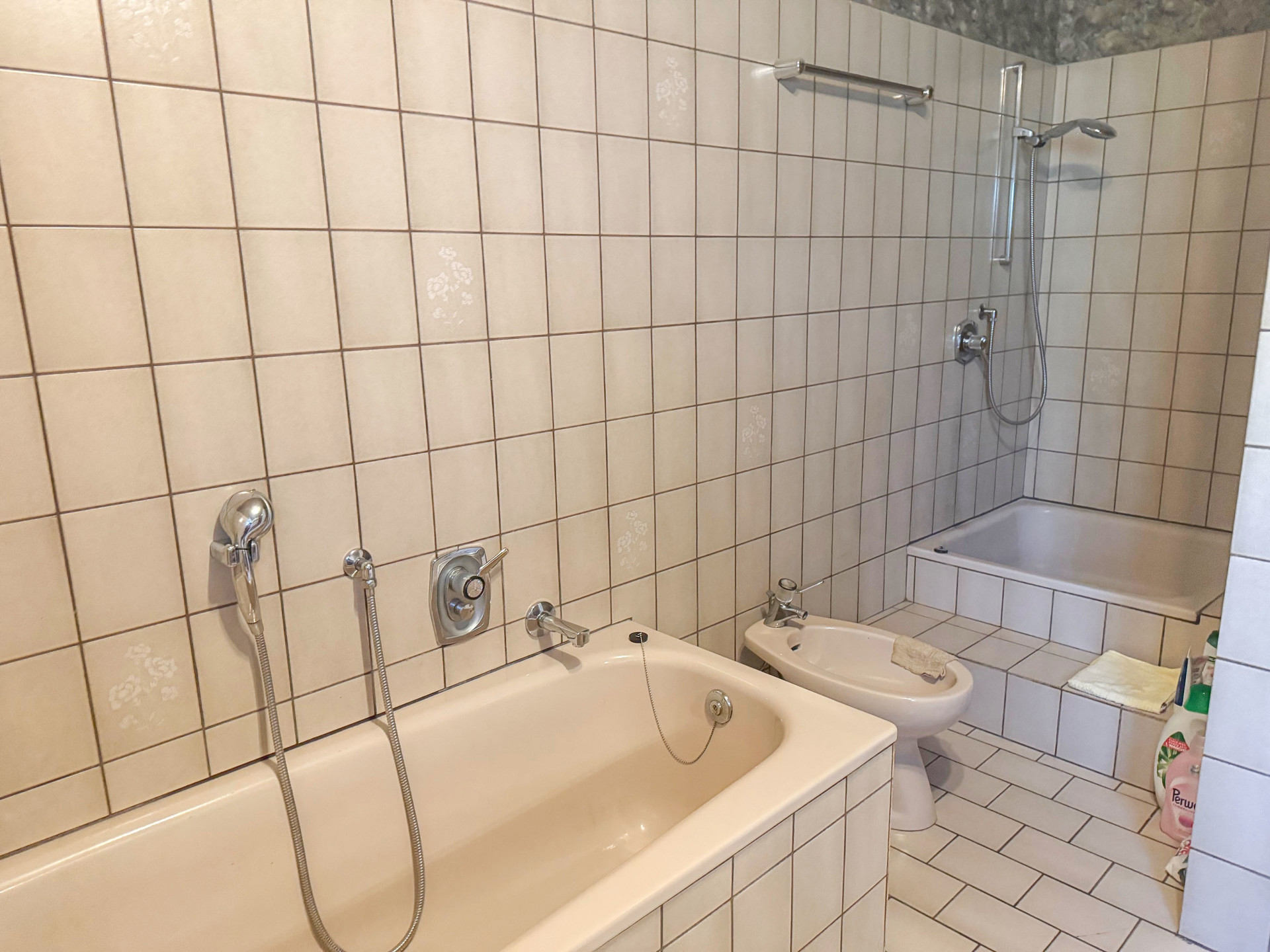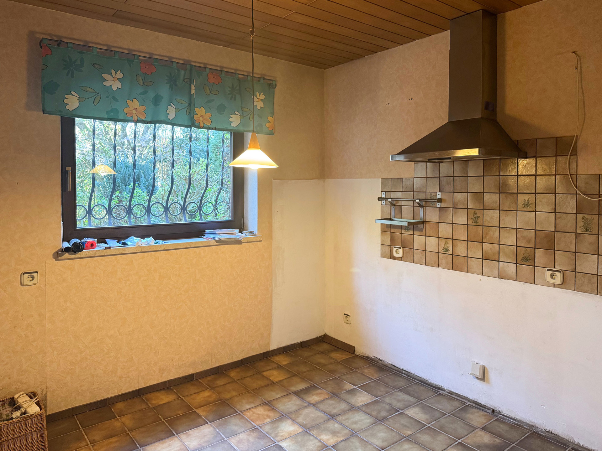 – Boden mit Fliesen und Laminat ausgelegt