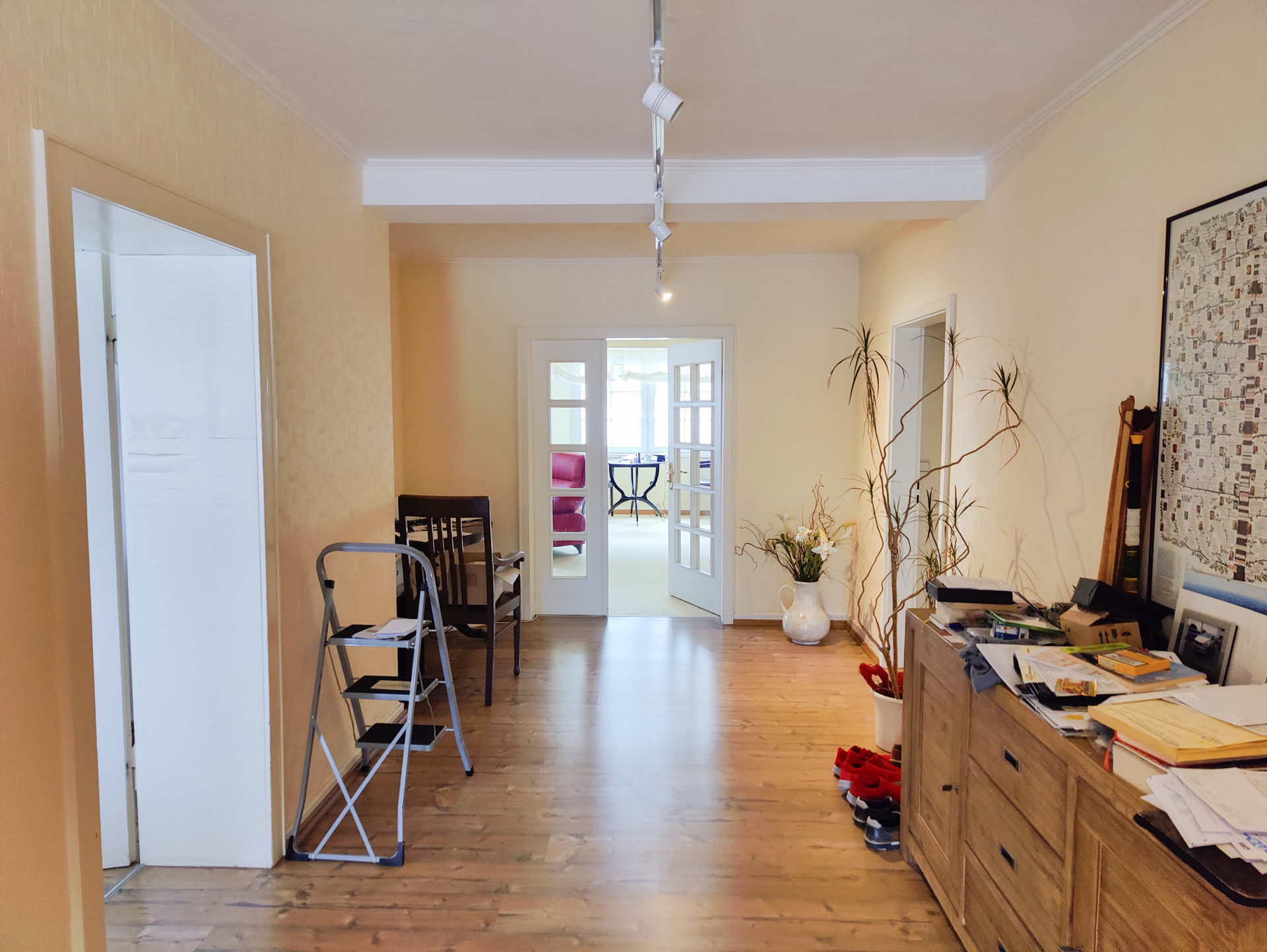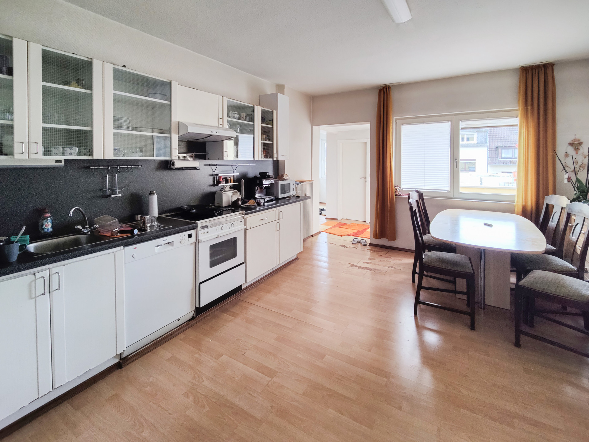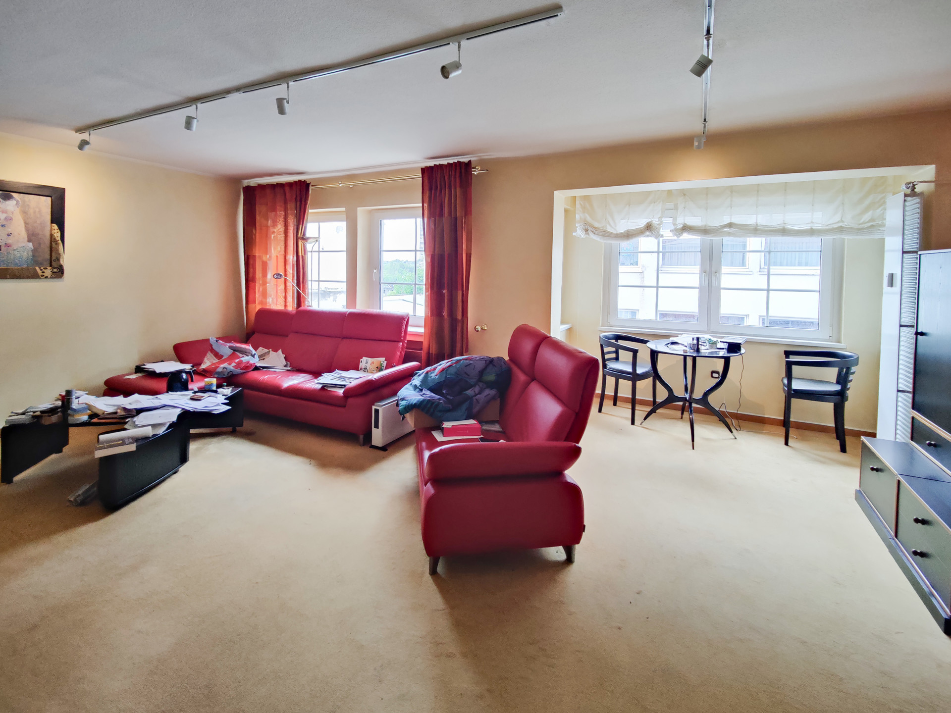 Im Erdgeschoss befindet sich ein großer Laden, der auch Teile des 1. Obergeschosses umfasst. Dieser ist zurzeit an die Caritas vermietet und hat eine Fläche von ca. 318 m². Im 1. Obergeschoss befindet sich außerdem eine vermietete Wohnung mit einer Fläche von ca. 132 m². Diese verfügt über 4 Zimmer und eine große Terrasse. Im 2. Obergeschoss wohnt derzeit der Eigentümer auf ca. 208 m². Ggf. könnte hier auch eine Aufteilung in 2 Wohnungen erfolgen. Das Dachgeschoss wurde z.T. schon ausgebaut (4 Zimmer+Bad+Balkon) und steht derzeit leer. Diese Fläche wurde nicht in der Wohnfläche berücksichtigt!