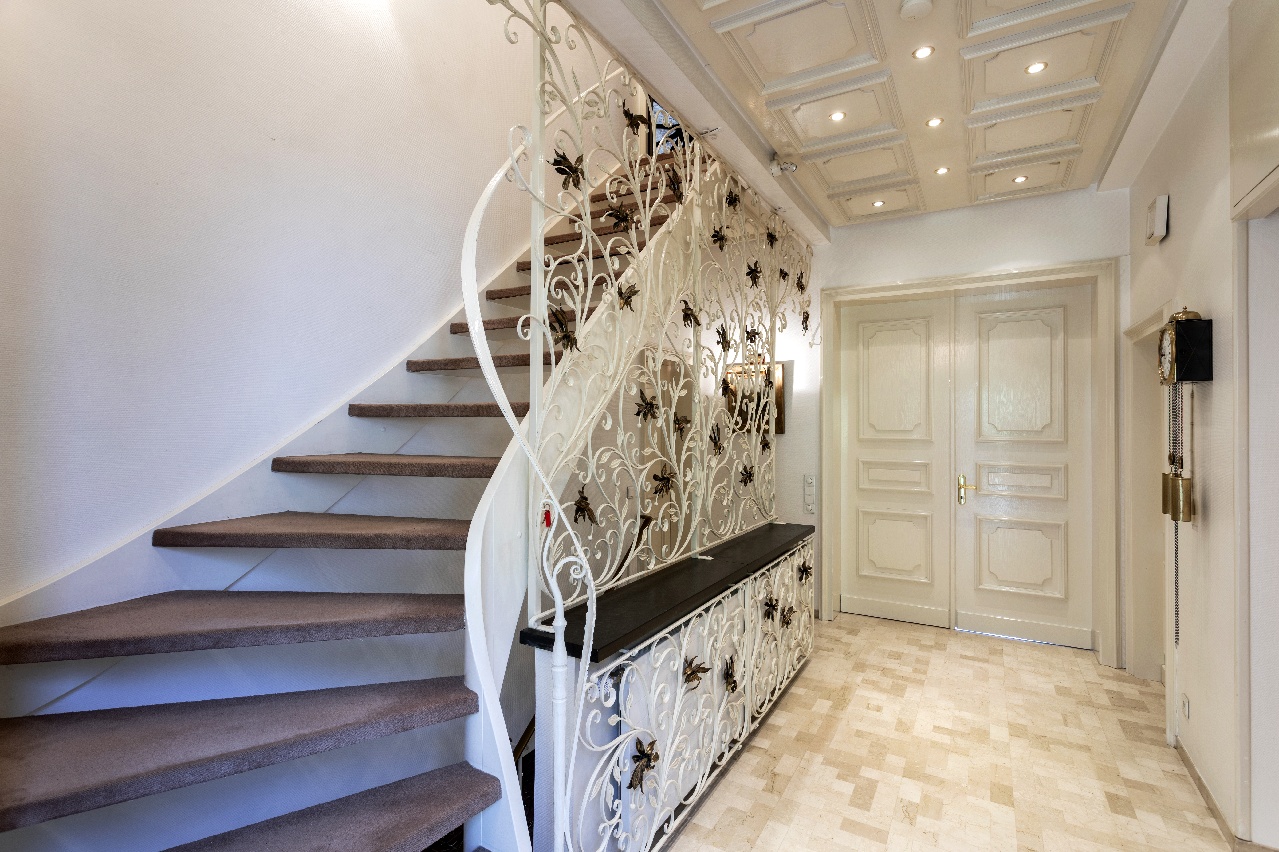 Geschosstreppen: Gewendelte Holztreppe mit Echtholzstufen mit Teppich belegt, Natursteintreppe zum Kellergeschoss, jeweils mit edlem schmiedeeisernen Schmuckgeländer