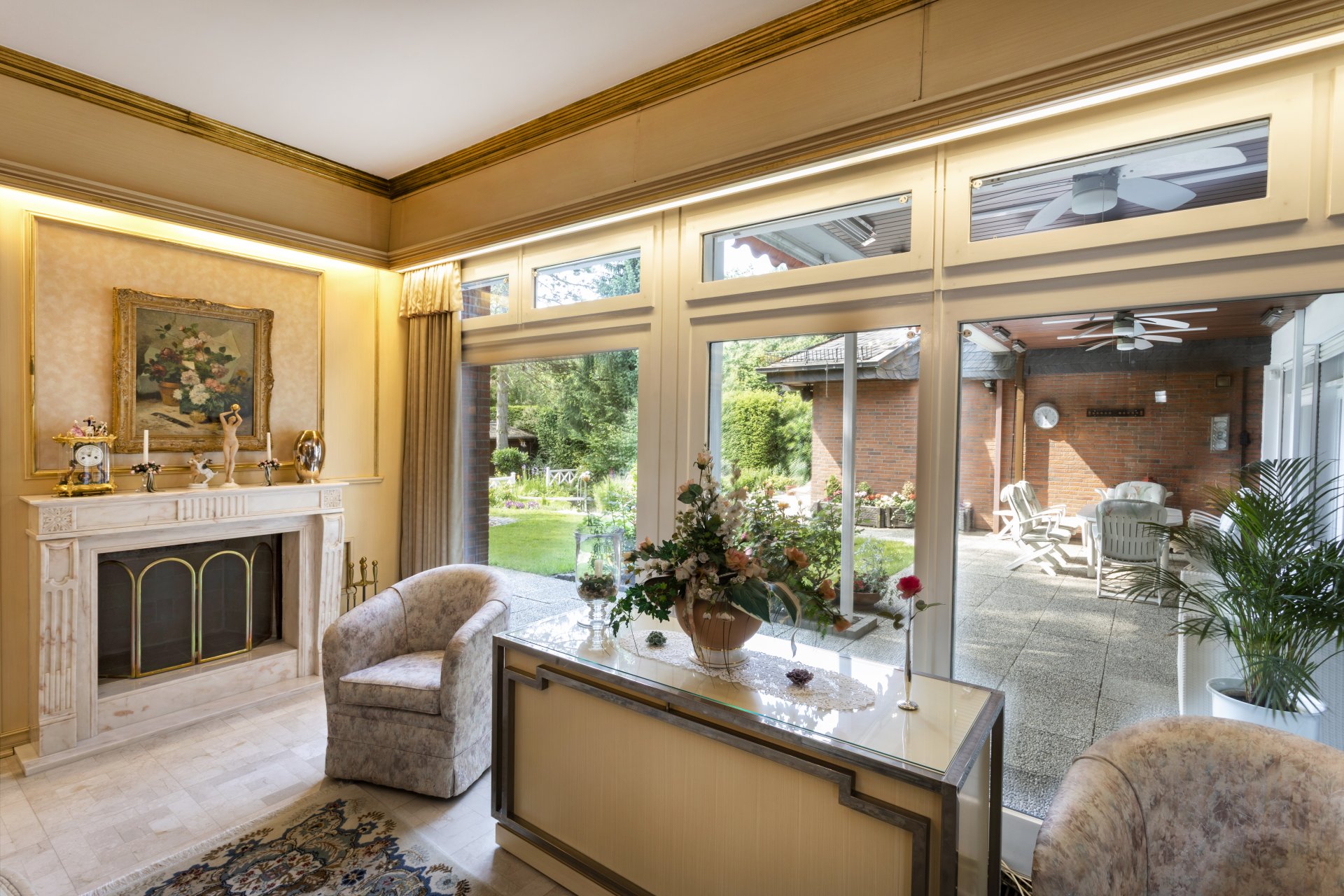 Außenanlagen: Eingezäunter Hauszugang mit Vorgarten, seitliche Zufahrt zu den derzeitigen Stallungen im KG und als Durchfahrt zum Garten. Rückseitiges ca. 2.800 m² großes durch Hecke und Zaun eingefriedetes Grundstück mit großen Rasenflächen, Teichanlage, Gartenhaus, Springbrunnen und beheizter Außenpool mit aufschiebbarem Dach