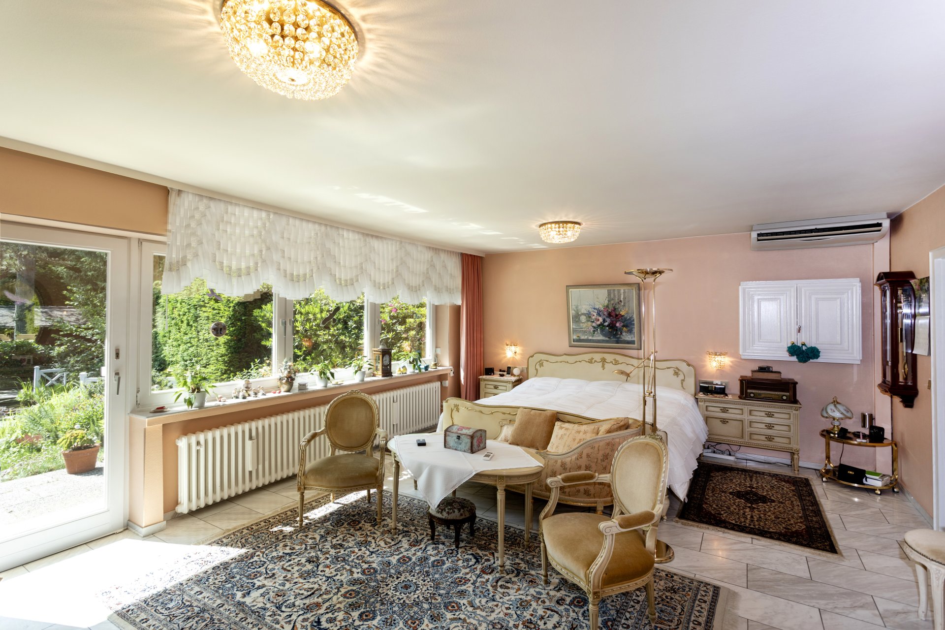 Bodenbeläge: Haupthaus: Eingangsbereich, aktueller Wohn-/ und Essbereich mit hochwertigen Natursteinen, Küche und Bad gefliest, separate Einliegerwohnung: Flur, G-WC, Küche und ein Raum gefliest, zwei weitere Zimmer durchgehend Marmor; Dachgeschoss: Bäder gefliest, ansonsten Eichenparkett.