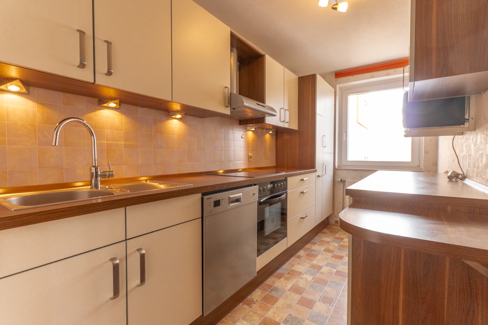 Direkt links befindet sich die Küche, ausgestattet mit einer modernen Einbauküche, die im Kaufpreis enthalten ist.