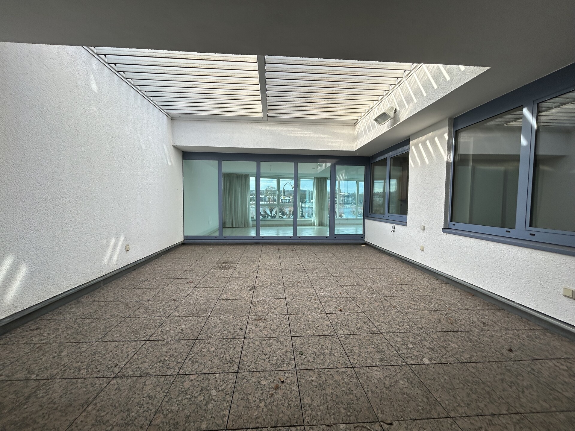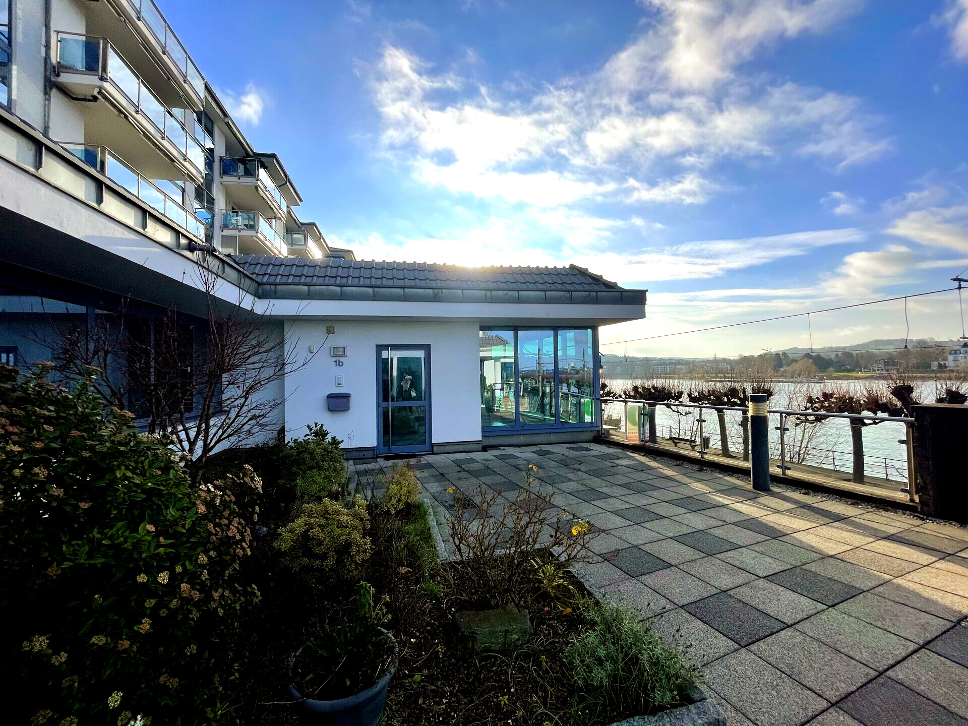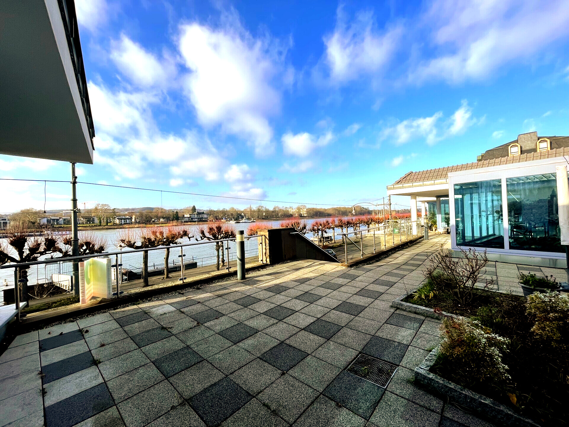 Die zum Rhein ausgerichtete Terrasse ist direkt über den Hauseingang zugänglich und bietet einen exklusiven Platz im Freien, um die Weite des Wassers zu genießen oder den Abend in entspannter Atmosphäre ausklingen zu lassen.