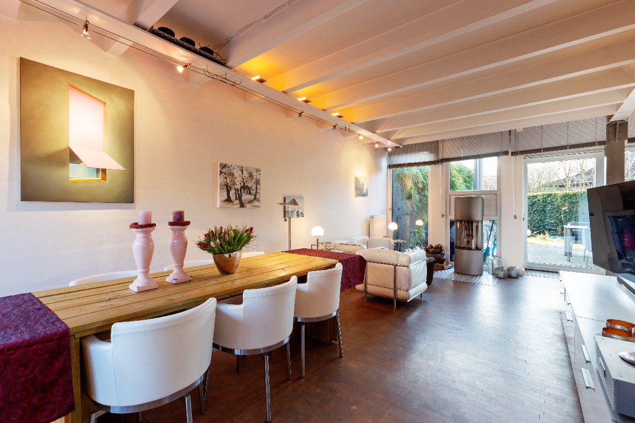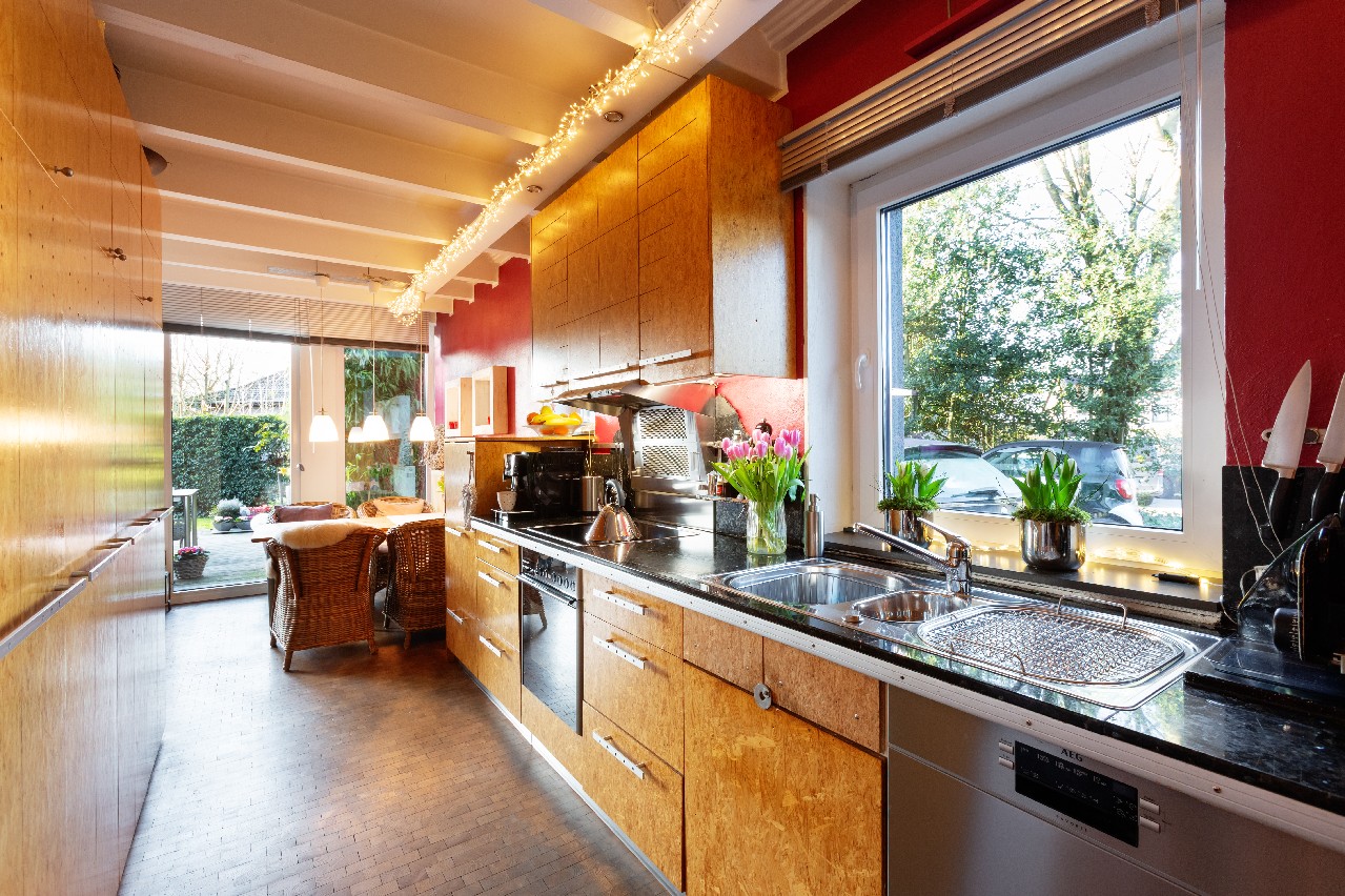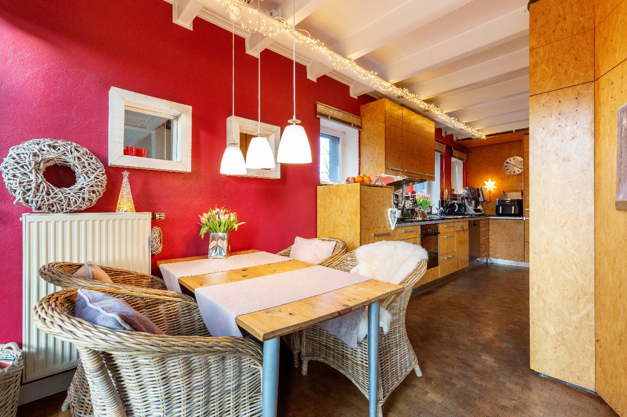 Ein besonderer Pluspunkt ist die offen gestaltete Erdgeschossebene, die Wohnen, Essen und Kochen zu einem harmonischen Lebensmittelpunkt verbindet. Der Wohn- und Essbereich wirkt durch die großzügige Raumaufteilung und die Fensterflächen hell und freundlich. Der integrierte Kaminofen unterstreicht das gemütliche Wohnambiente und schafft besonders in der kalten Jahreszeit eine behagliche Atmosphäre. Von hier aus eröffnet sich ein schöner Blick in den Garten – eine gelungene Verbindung von Innen- und Außenbereich.