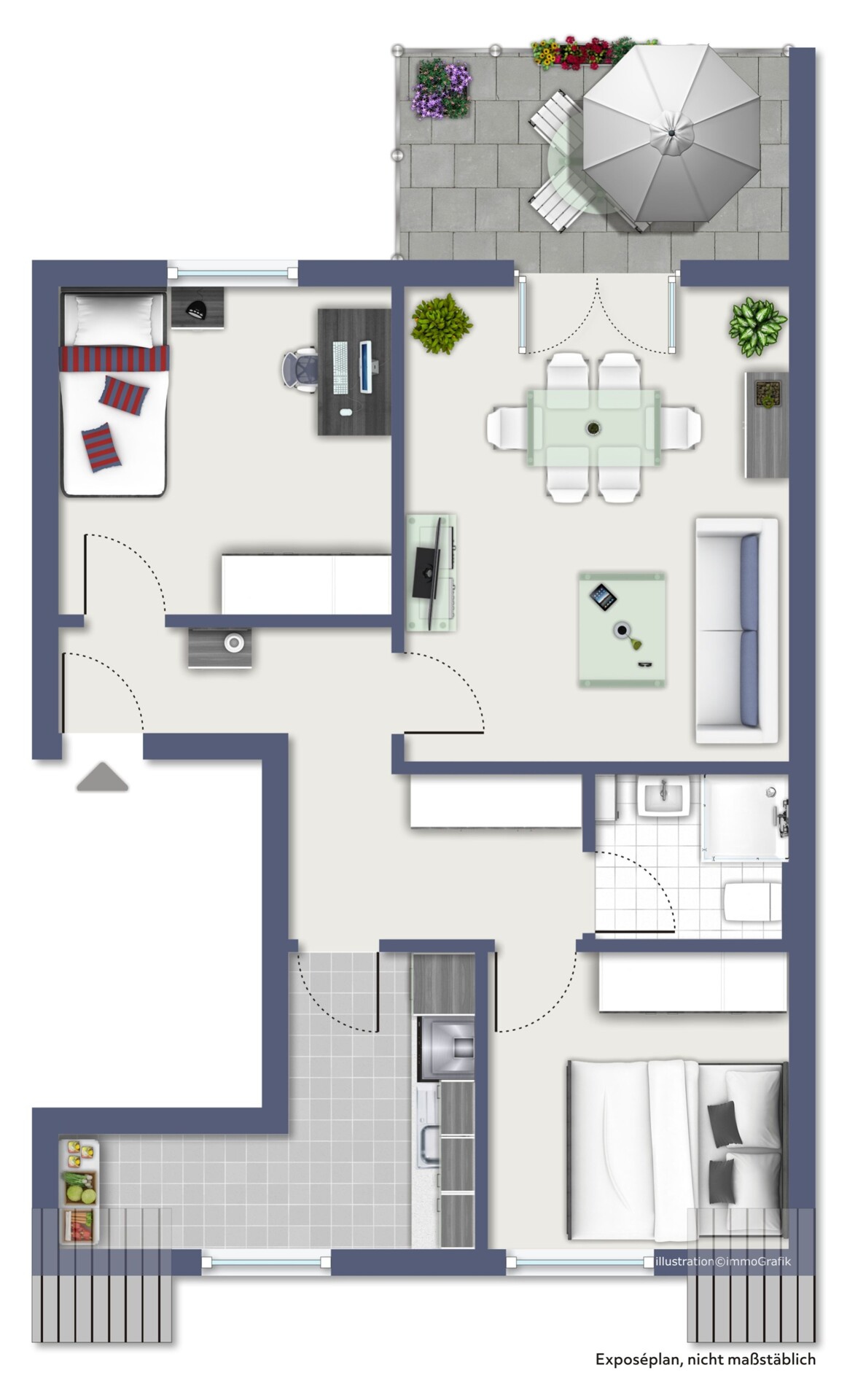 Auf rund ca. 72 m² Wohnfläche nutzen die Mieter drei gut geschnittene Zimmer, darunter zwei Schlafzimmer, die sich ideal als Rückzugsort, Kinderzimmer oder Homeoffice nutzen lassen. Das Duschbad ist modern und funktional gestaltet. In den Wohn- und Schlafbereichen sorgt ein Laminatboden für eine angenehme und pflegeleichte Wohnatmosphäre.
