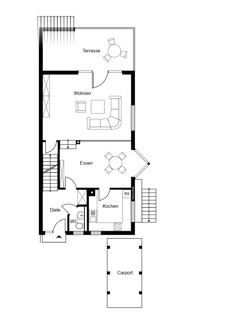 Die zweite Wohneinheit ist vollständig getrennt: Der Zugang erfolgt rechts am Haus vorbei über eine Treppe nach unten in die untere Etage. Sie ist komplett unabhängig von der zu verkaufenden Einheit und hat keinerlei Berührungspunkte im täglichen Wohnen.